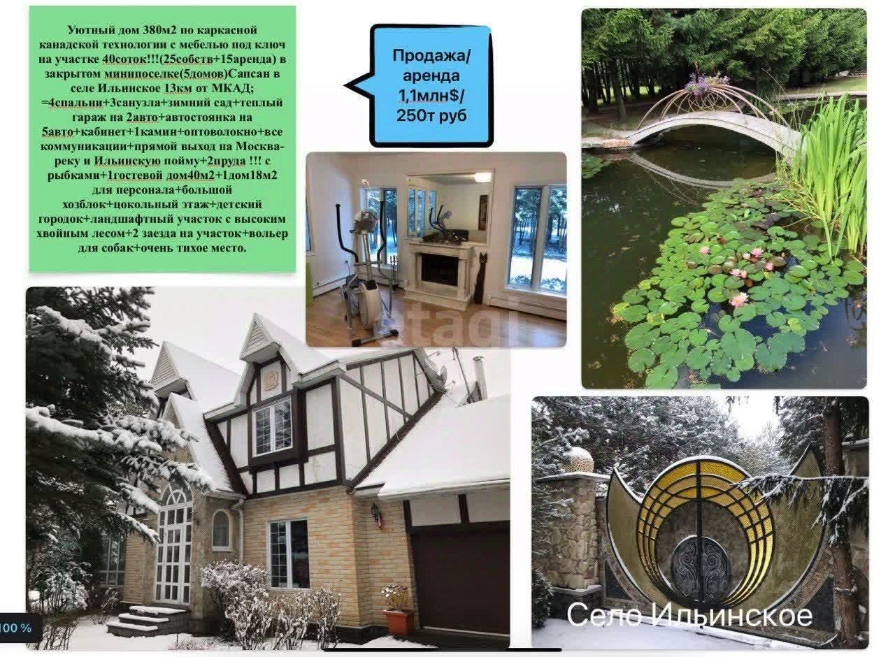 Номер в базе: 805752. Продается дом в дизайнерском стиле, по каркасной канадской технологии. Дом находится в закрытом минипоселке (5 домов) в престижной районе, рядом со всей инфраструктурой, с прямым выходом на Москву-реку и Ильинскую пойму. На участке 40 соток (25собств.+15аренда) располагается дом 380м, двухэтажный гостевой дом на 40м, и дом 18м, для персонала. В главном доме: 4 спальни, 3 санузла, кабинет, зимний сад, теплый гараж на два автомобиля, автостоянка на 5 авто. Гостевой дом: большой хозблок, цокольный этаж, детский городок, ландшафтный участок с высоким хвойным лесом. Два заезда на участок. Превосходная транспортная доступность всего лишь 13 км от МКАД по Ильинскому и Новорижскому, так же по Рублево - Успенскому шоссе. Участок ровный, с большой свободной площадью, с старым домом который не зарегистрирован. На участке имеется небольшой плодовый сад. Свет на 15КВ, газ по границе, центрально водоснабжение. Развитая инфраструктура рядом имеются сетевые магазины, медицинские клиники, школы, сады, салоны красоты и многое другое необходимое для комфортной жизни! В пешей доступности Москва - Река , рядом музей - усадьба Архангельское с живописной территорией. Идеальное предложение в престижном районе Подмосковья! Звоните в любое время, оперативный показ, быстрый выход на сделку. Код пользователя: 93705