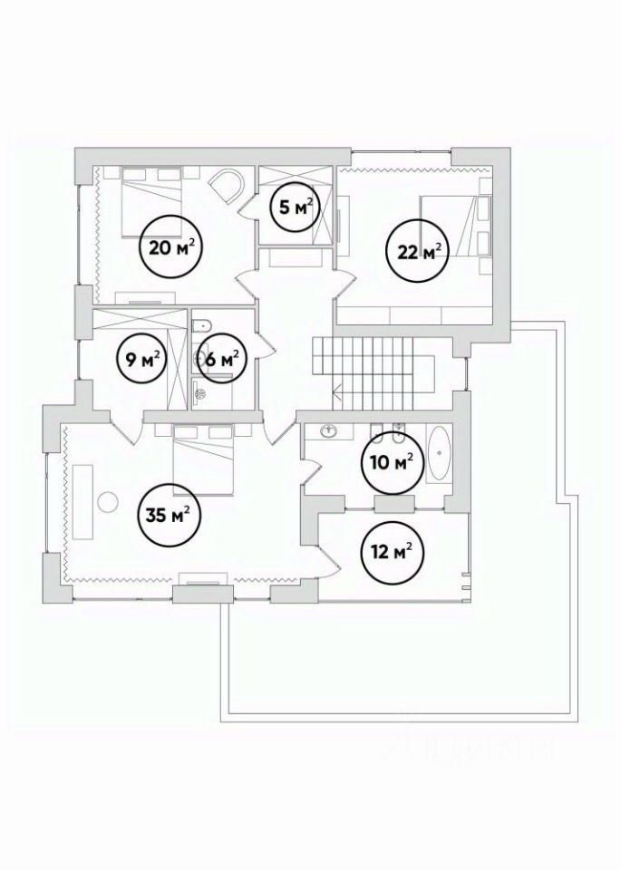 В коттедже предусмотрено 4 спальни. Мастер спальня 35 м² имеет собственную ванную комнату 10 м², гардеробную и балкон. Общая площадь мастер спальни 63 м². Высокие потолки 3.3 метра и большие панорамные окна в пол 3х3 метра отличительная особенность архитектурного стиля поселка.