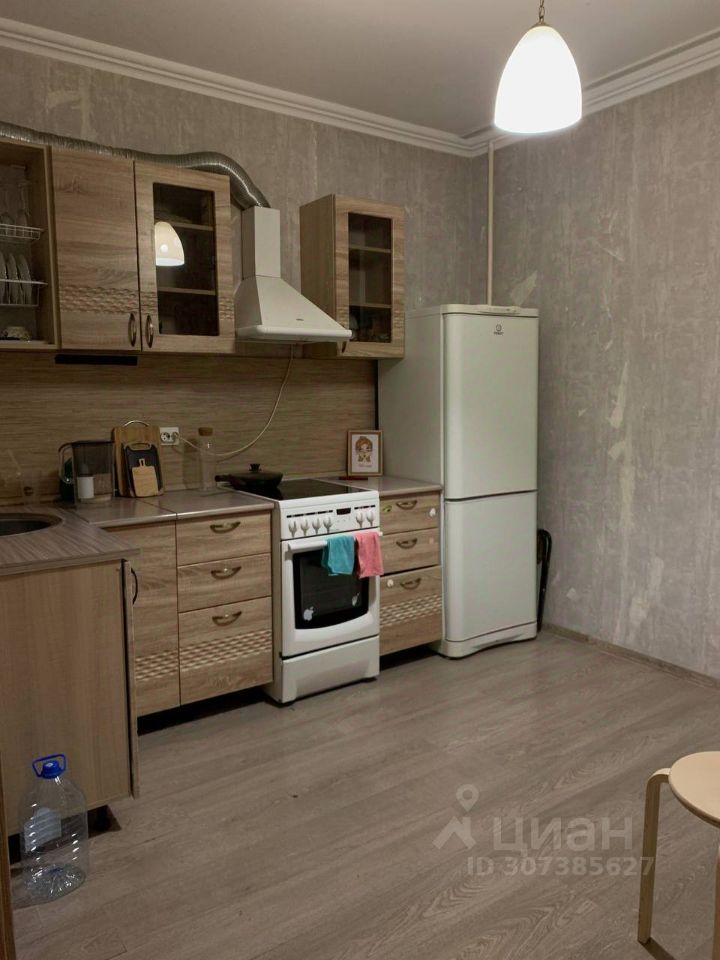 Есть кухонный гарнитур, плита, вытяжка, холодильник. Обеденный стол.