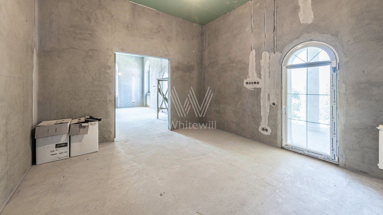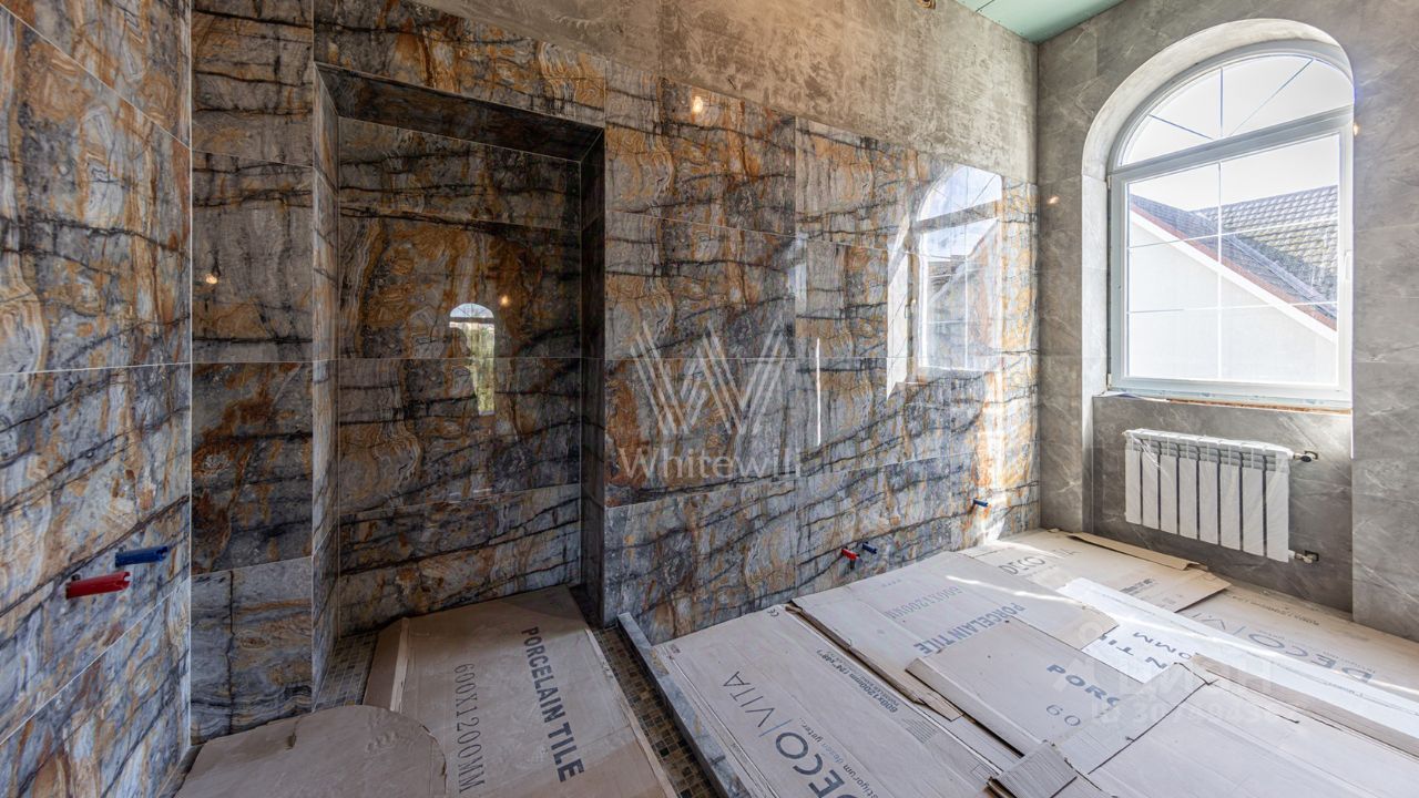ID 12 700. Захарково. Загородный дом площадью 1018 м² построен на уютном полевом участке. Фасад здания в неоклассическом стиле облицован желтоватой штукатуркой. Внутри выполнена отделка whitebox, третий уровень готов ''под ключ''. Во всех санузлах, а также на полах первого этажа уложена плитка, установлена система тёплых полов. В гостиной установлены механизмы в потолке для опускания люстр. Планировка коттеджа включает 9 спален, кухню, комнату для персонала с отдельным входом и помещение свободного назначения, которое подходит для организации кабинета. На участке можно выполнить ландшафтный дизайн и обустроить зону барбекю.