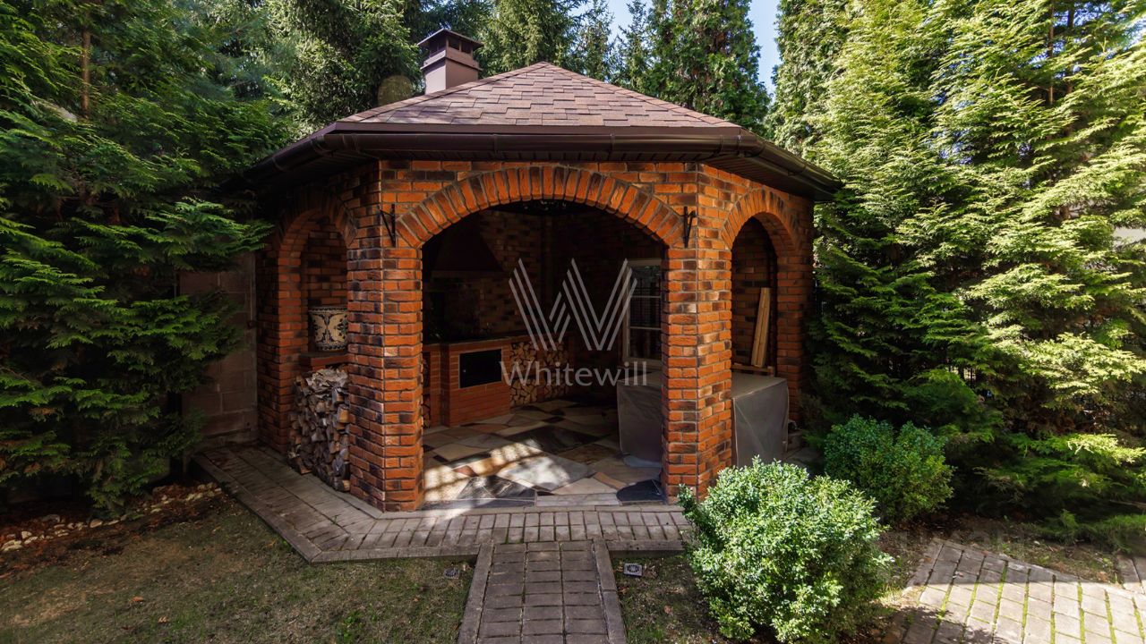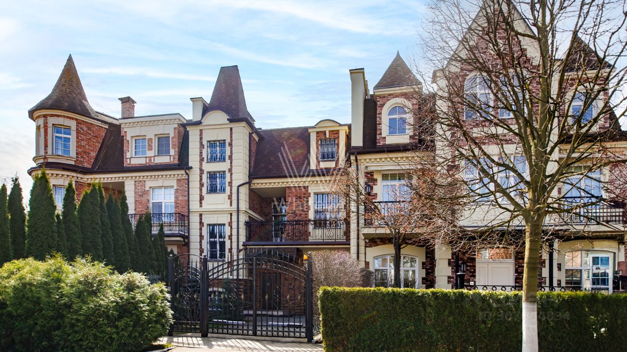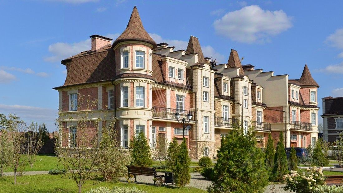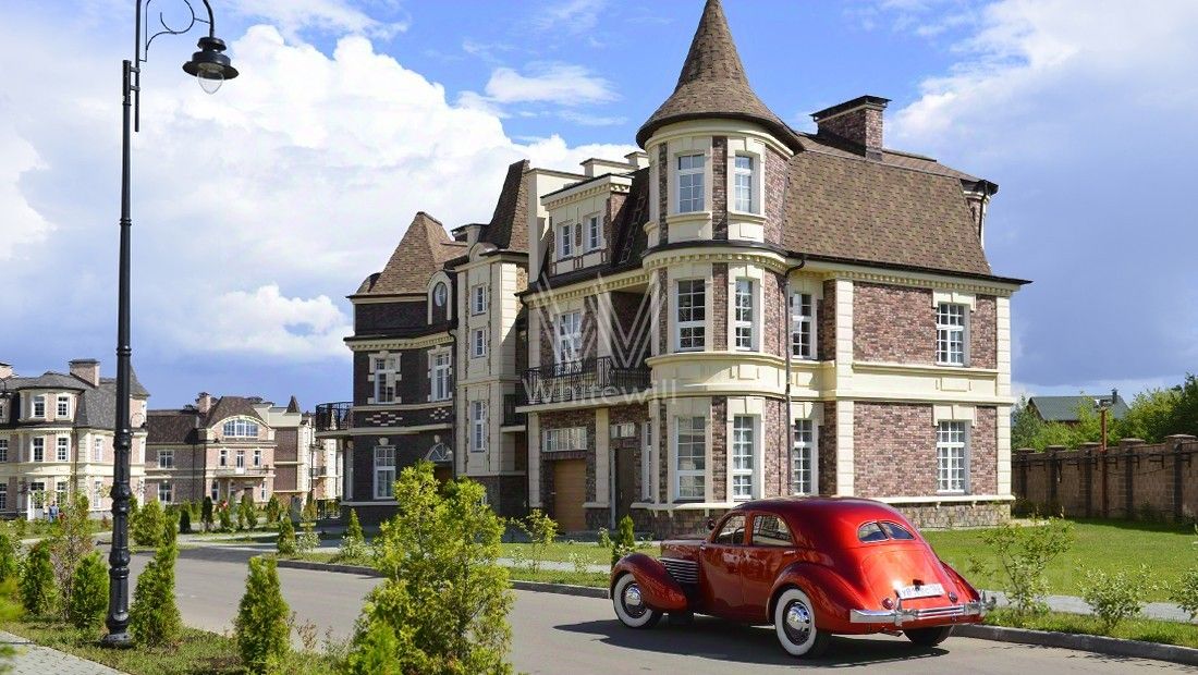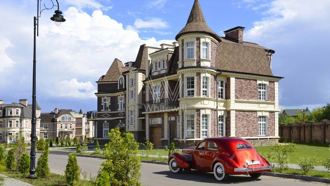 Ильинка Лейнхаусы. Таунхаус площадью 294 м² расположен в центральной части секции на полевом участке 3 сотки. Фасад здания выполнен в европейском стиле, облицован клинкерным кирпичом и декорирован бежевыми вставками. Интерьер сочетает элементы классики и современности, в отделке использованы бежевые и черные оттенки, орнаменты и стекло, фактура дерева и камня. Планировка резиденции включает 3 спальни, гостиную с камином, переходящую в кухню-столовую, кабинет, спортзал и финскую сауну. В свободной комнате можно разместить дополнительную спальню или зону отдыха. В контуре таунхауса предусмотрен гараж на 1 машину. На участке, по периметру которого высажены взрослые туи, создающие атмосферу приватности, вымощены дорожки и обустроена беседка-барбекю.