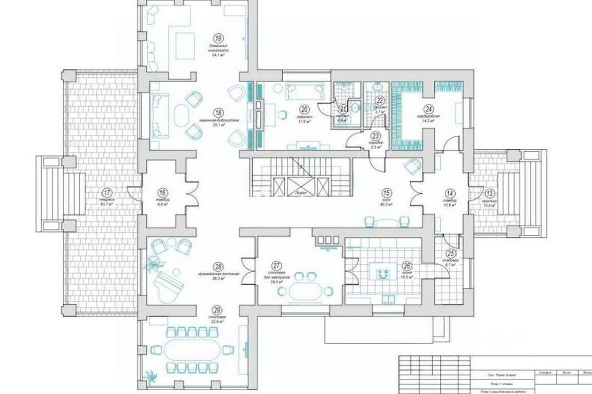 ID 13817 Загородный дом площадью 700 м2 построен на просторном участке 24 сотки в коттеджном посёлке ''Рубин Эстейт''. Коттедж представлен без отделки. В доме можно спланировать 5 спален, 2 кабинета или дополнительные спальни, SPA-зону с бассейном, домашний кинотеатр, квартиру для персонала и другие необходимые помещения. 1 этаж: столовая - 2 шт., кинотеатр, каминный зал, терраса, лифт.
