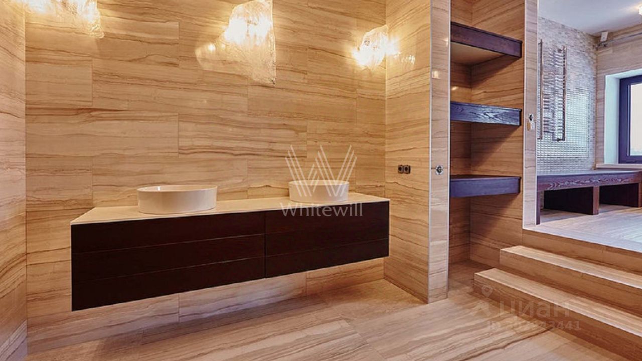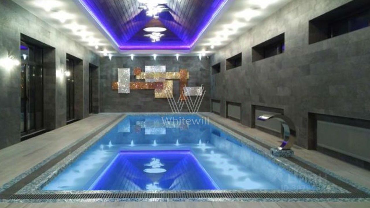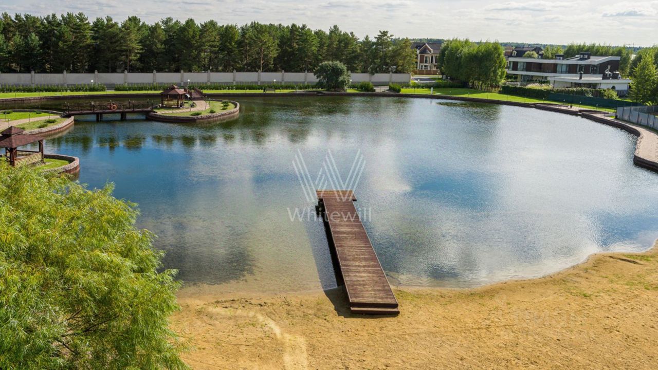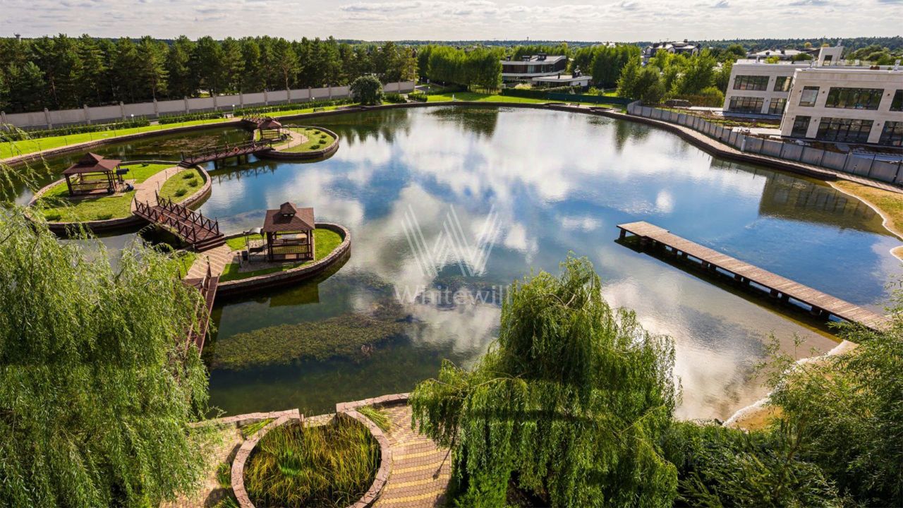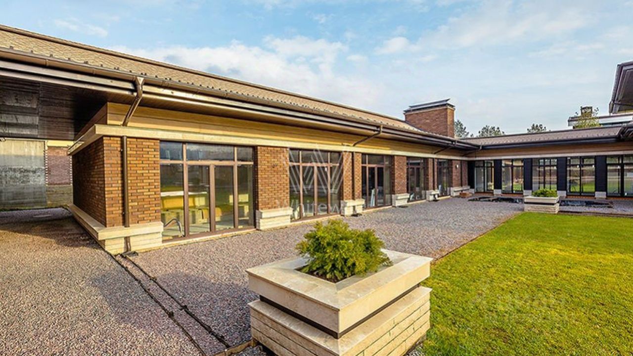 Никольская слобода. Загородное поместье с бассейном и 6-ю спальнями распложено около пруда, на участке 55 соток. Дом площадью 1866 построен в стиле американского архитектора ХХ века Френка Ллойда Райта — фасад в натуральных цветах с широким карнизом хорошо отлично вливается в природное окружение. На первом этаже дома расположена зона отдыха с бассейном и турецкой баней. На втором этаже 5 спален с санузлами и несколькими гардеробными. Интерьер выполнен в неоклассическом стиле в теплых тонах, дополнен дизайнерской мебелью. На участке постелен газон, проведена подсветка, дорожки вымощены плиткой и деревом. В дом встроен гараж для 3 машин с квартирой для персонала.