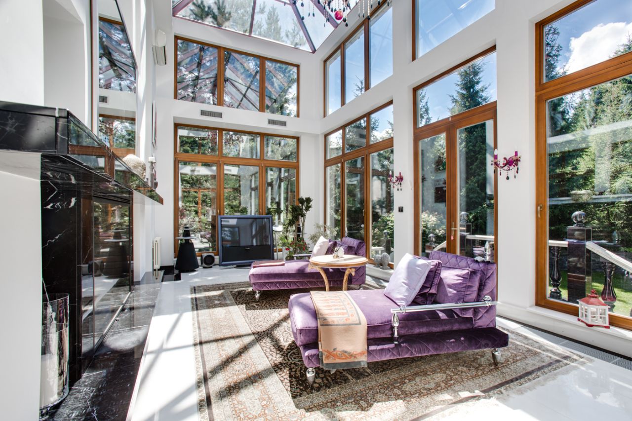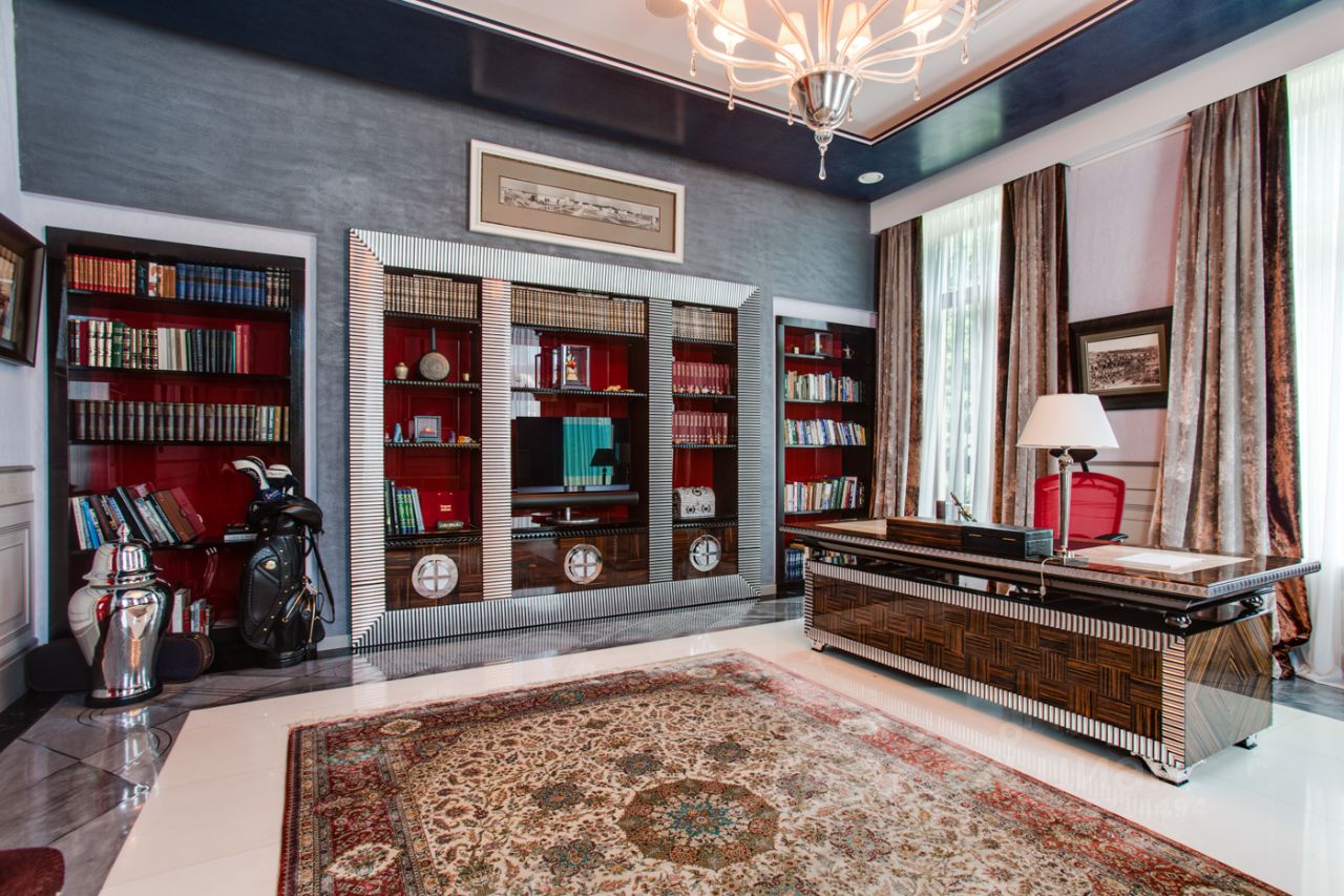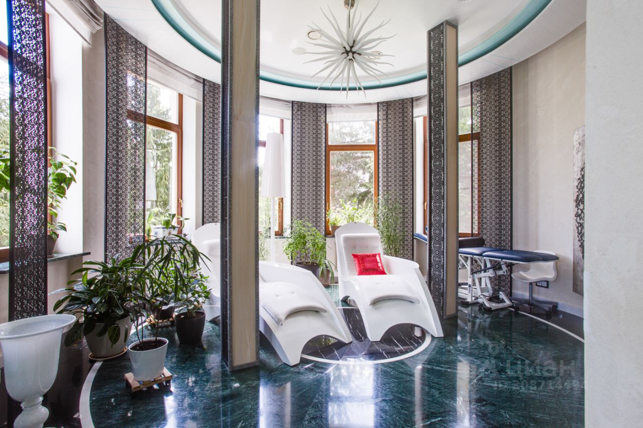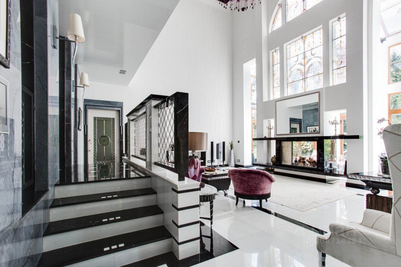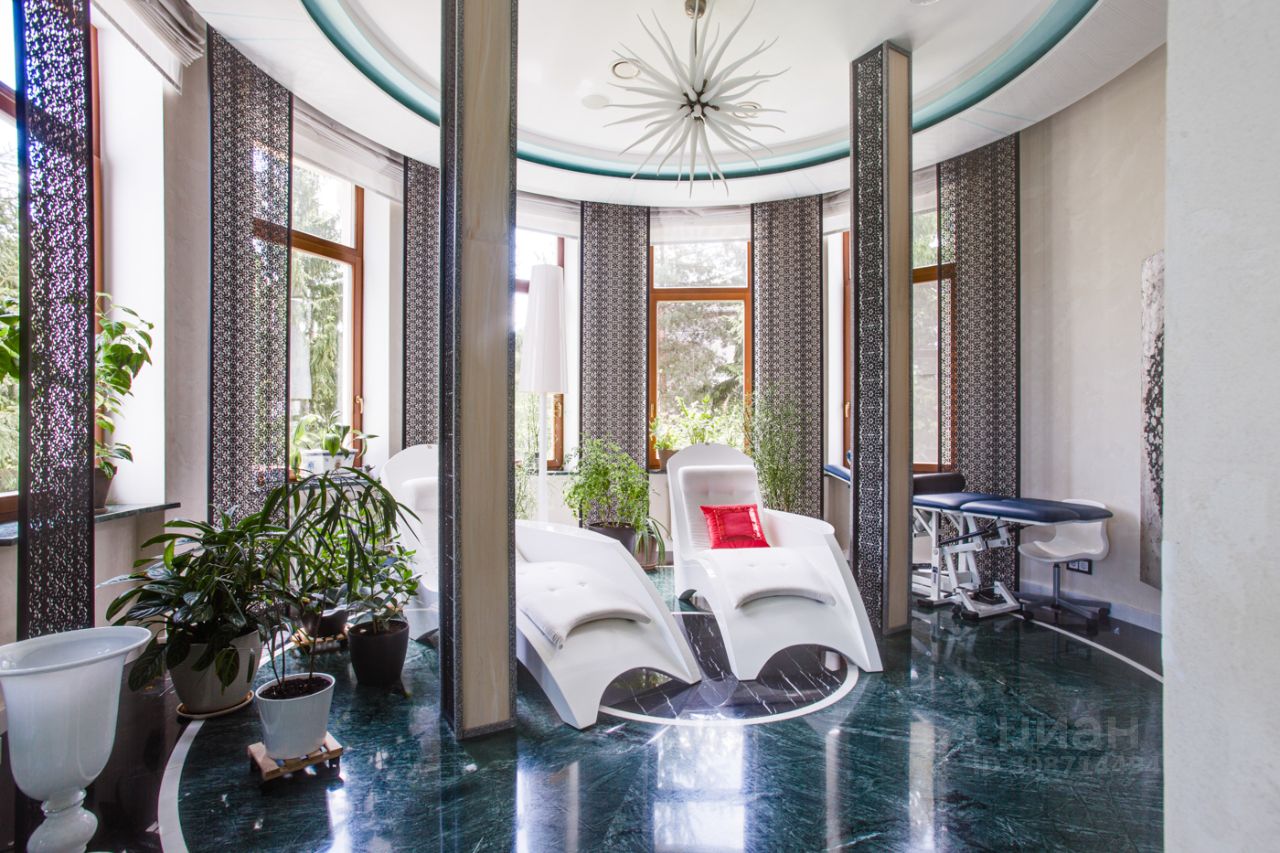 Дом выполнен в современном стиле с элементами классики и ар-деко. В отделке использованы только высококачественные материалы: натуральный камень, дерево, мрамор, стекло. Интерьеры дома поражают своей элегантностью, изысканностью и функциональностью. Здесь есть все для комфортной жизни. Просторная гостиная с потолками 11 метров объединенная с зимним садом двухсторонним камином. Полностью оборудованные кухня и столовая. 4 спальни со своими гардеробными и ванными комнатами. Два кабинета, библиотека, игровая комната для детей, спортзал, сауна, хамам, снежная комната, криосауна, пятиметровый бассейн с противотоком, домашний кинотеатр и комната для прослушивания музыки.