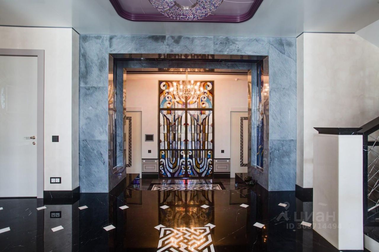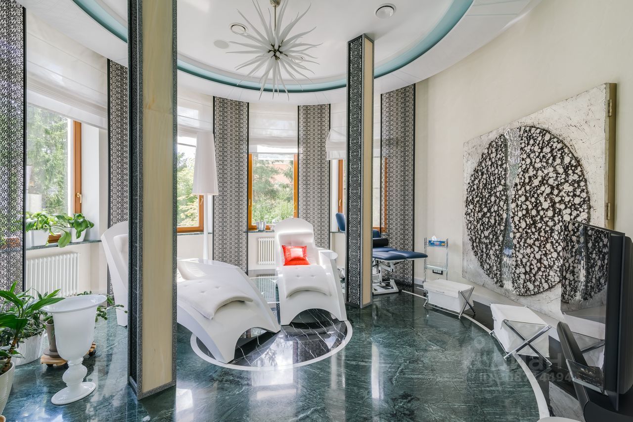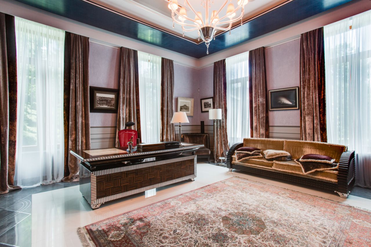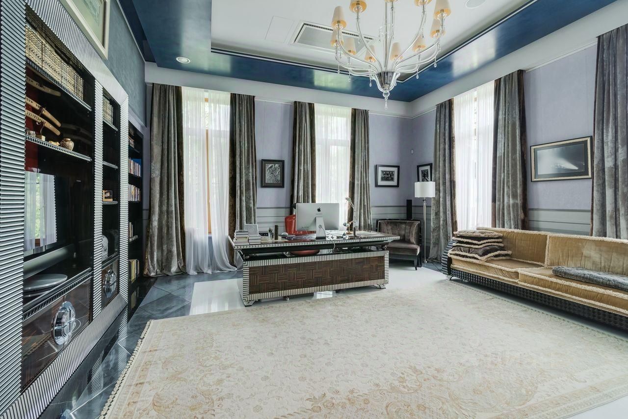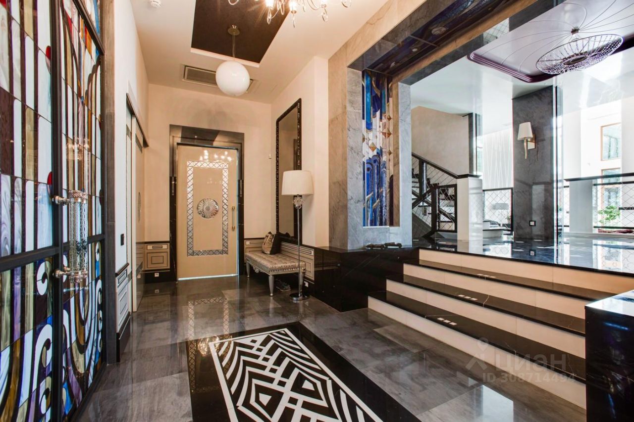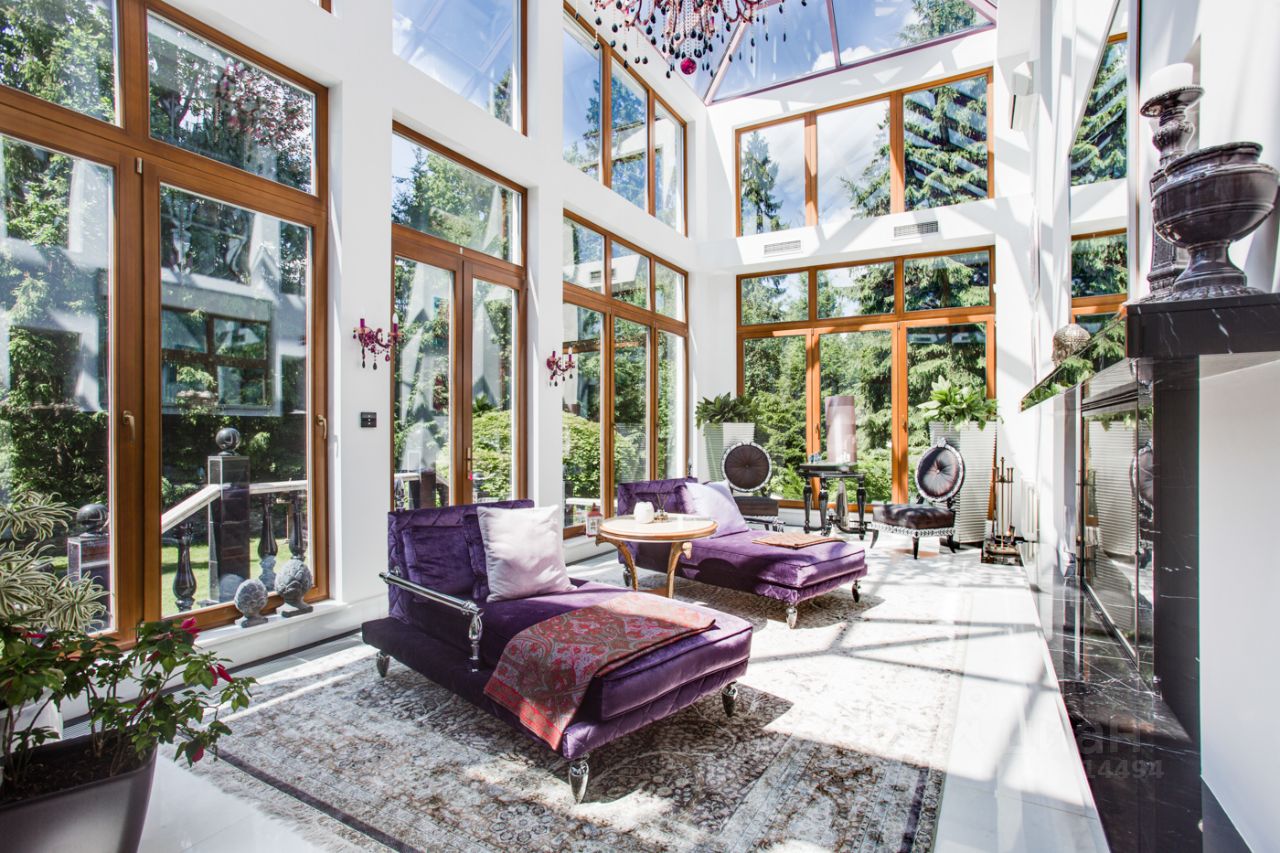 Дом выполнен в современном стиле с элементами классики и ар-деко. В отделке использованы только высококачественные материалы: натуральный камень, дерево, мрамор, стекло. Интерьеры дома поражают своей элегантностью, изысканностью и функциональностью. Здесь есть все для комфортной жизни. Просторная гостиная с потолками 11 метров объединенная с зимним садом двухсторонним камином. Полностью оборудованные кухня и столовая. 4 спальни со своими гардеробными и ванными комнатами. Два кабинета, библиотека, игровая комната для детей, спортзал, сауна, хамам, снежная комната, криосауна, пятиметровый бассейн с противотоком, домашний кинотеатр и комната для прослушивания музыки.