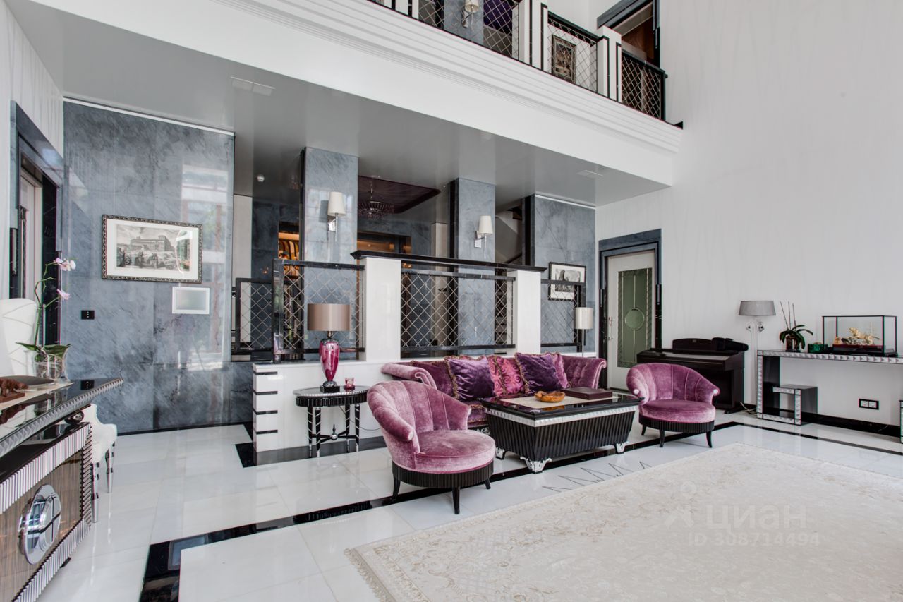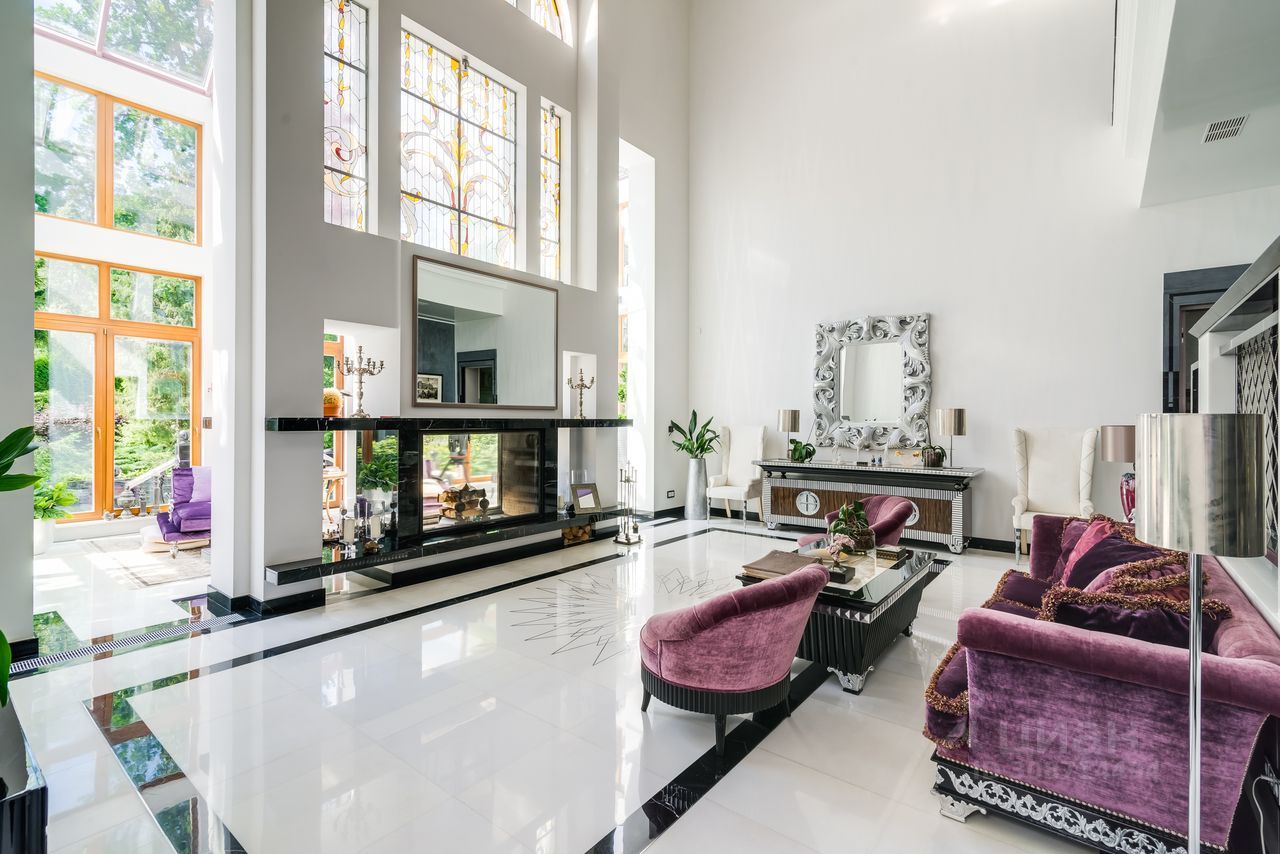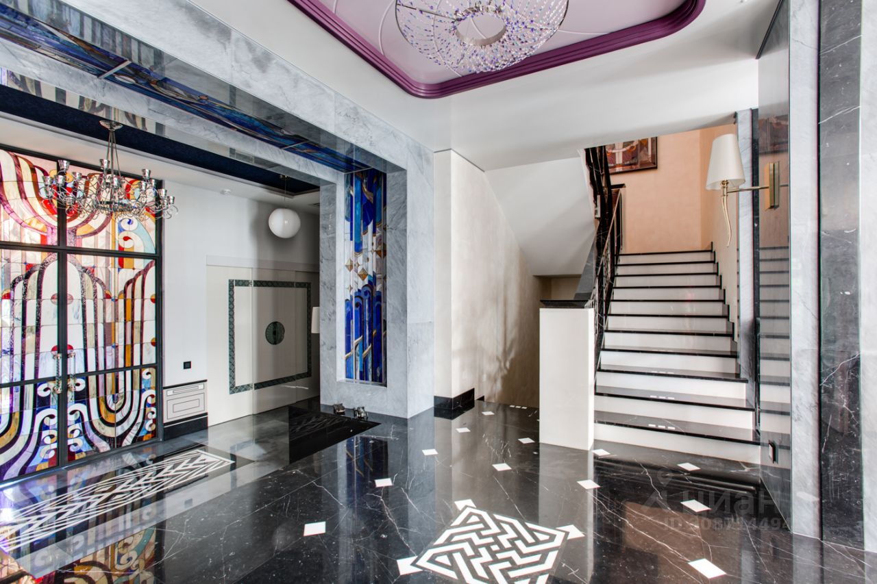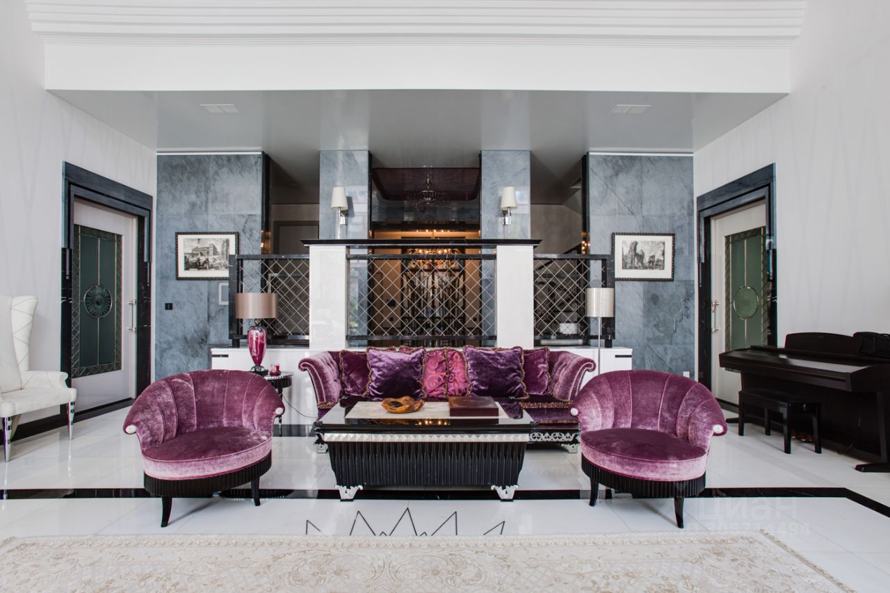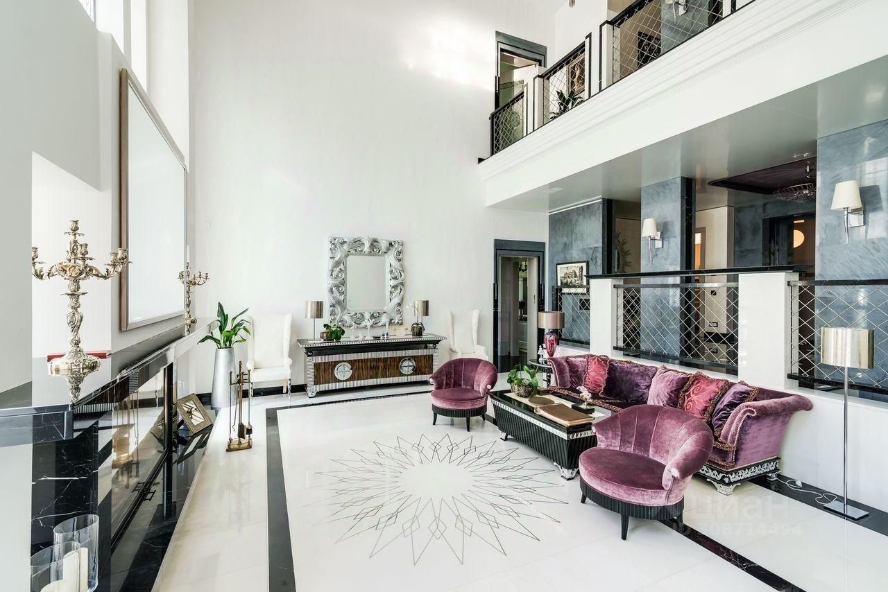 Дом выполнен в современном стиле с элементами классики и ар-деко. В отделке использованы только высококачественные материалы: натуральный камень, дерево, мрамор, стекло. Интерьеры дома поражают своей элегантностью, изысканностью и функциональностью. Здесь есть все для комфортной жизни. Просторная гостиная с потолками 11 метров объединенная с зимним садом двухсторонним камином. Полностью оборудованные кухня и столовая. 4 спальни со своими гардеробными и ванными комнатами. Два кабинета, библиотека, игровая комната для детей, спортзал, сауна, хамам, снежная комната, криосауна, пятиметровый бассейн с противотоком, домашний кинотеатр и комната для прослушивания музыки.