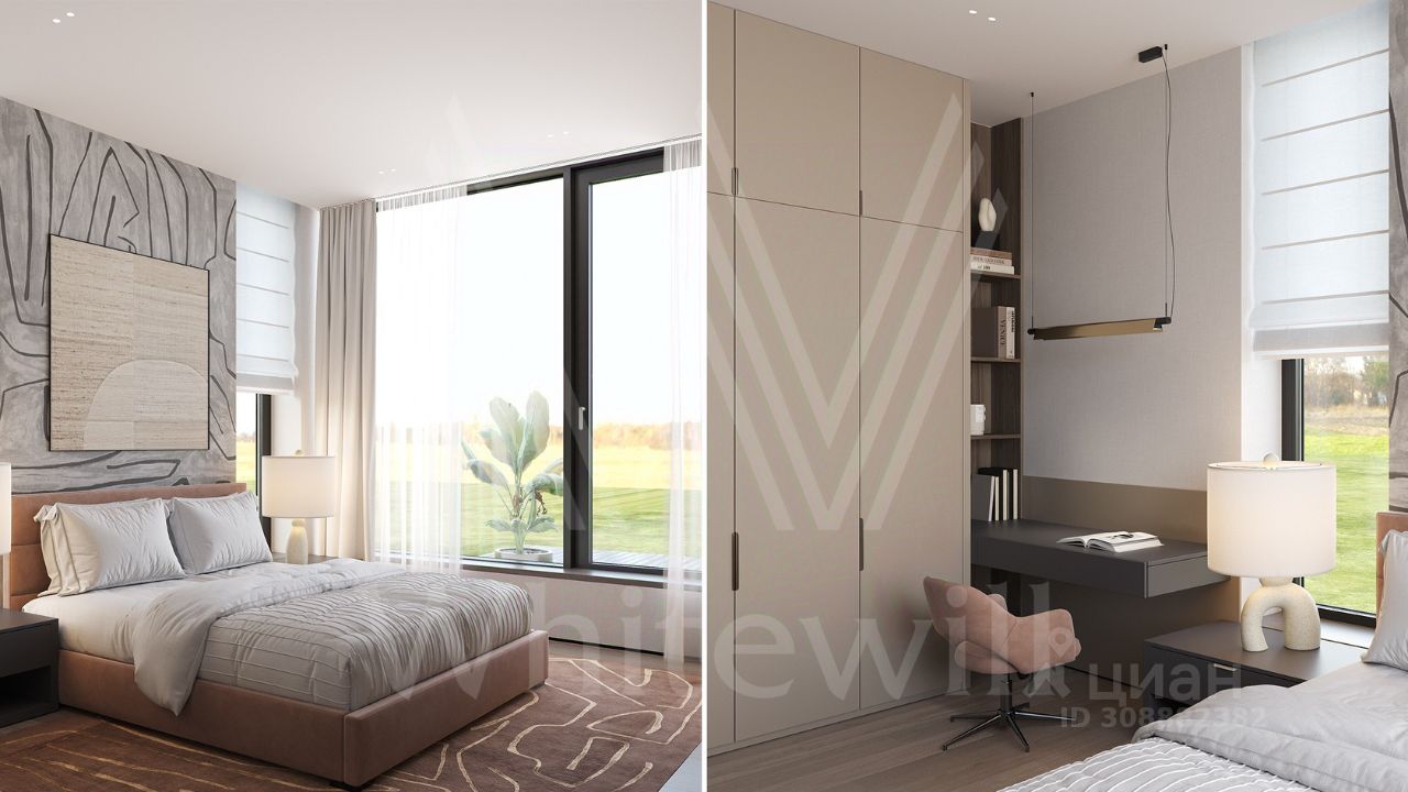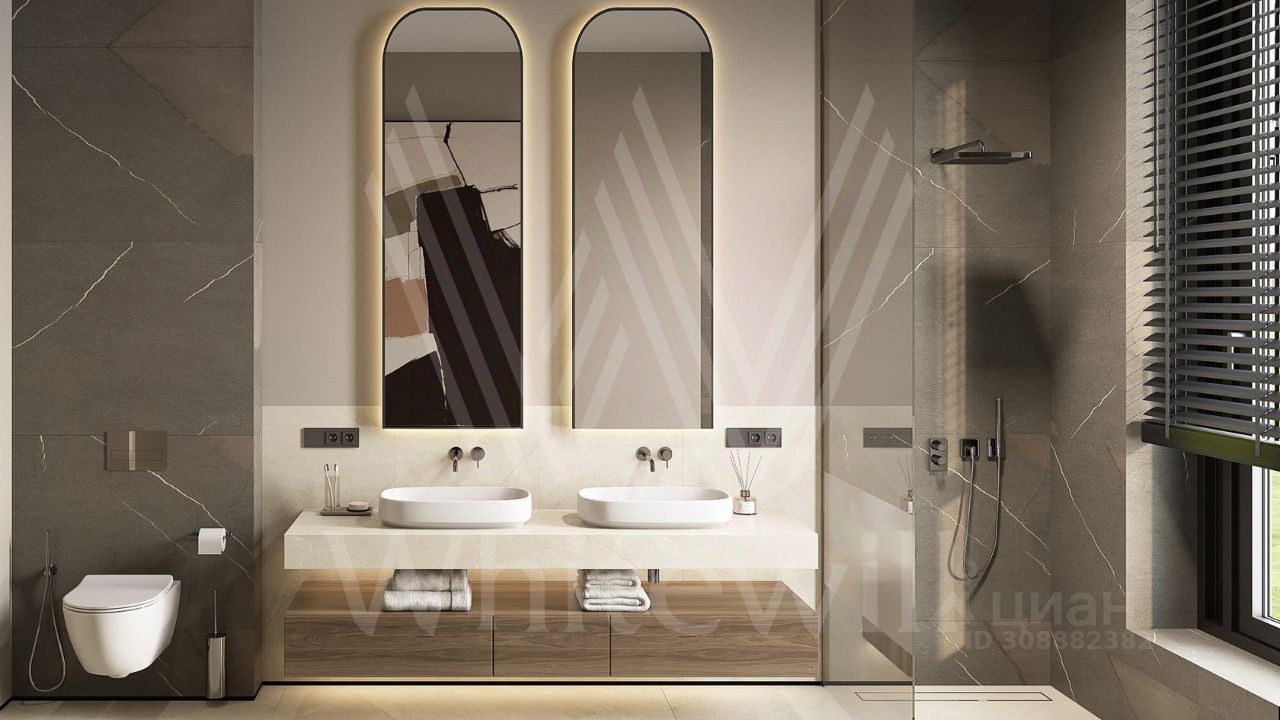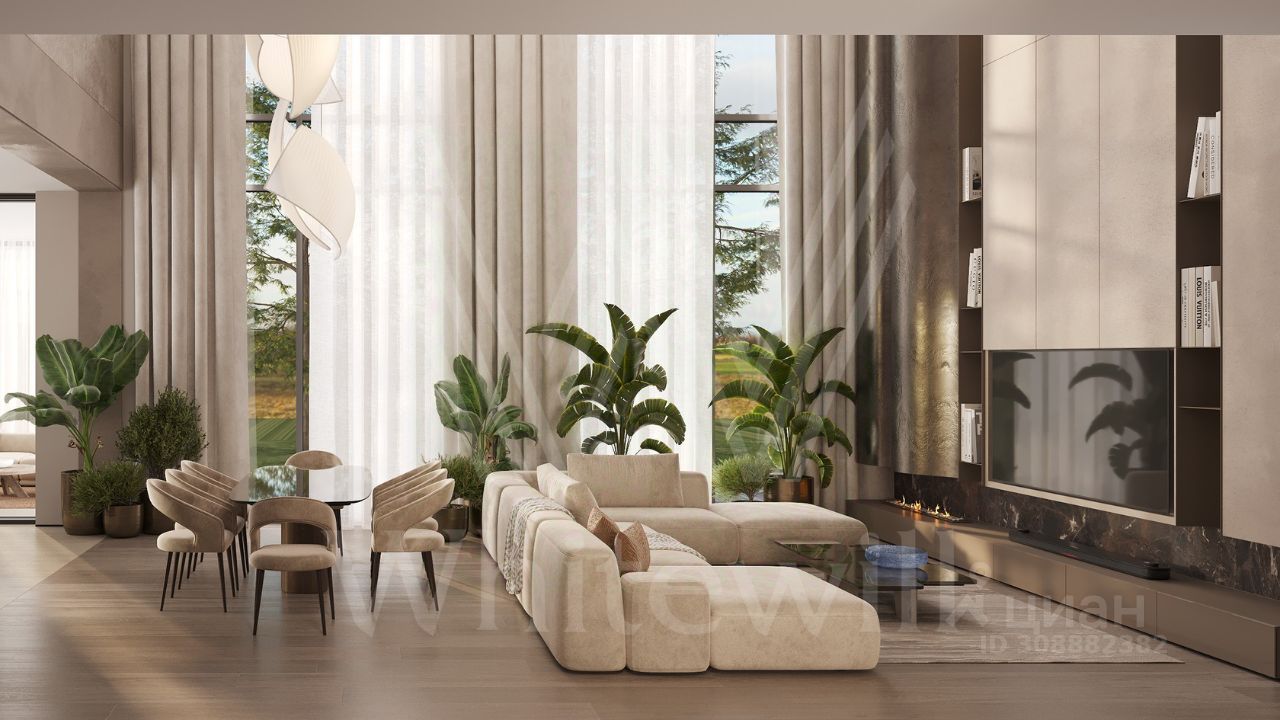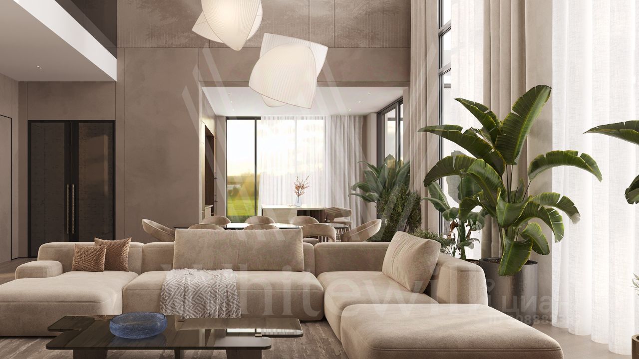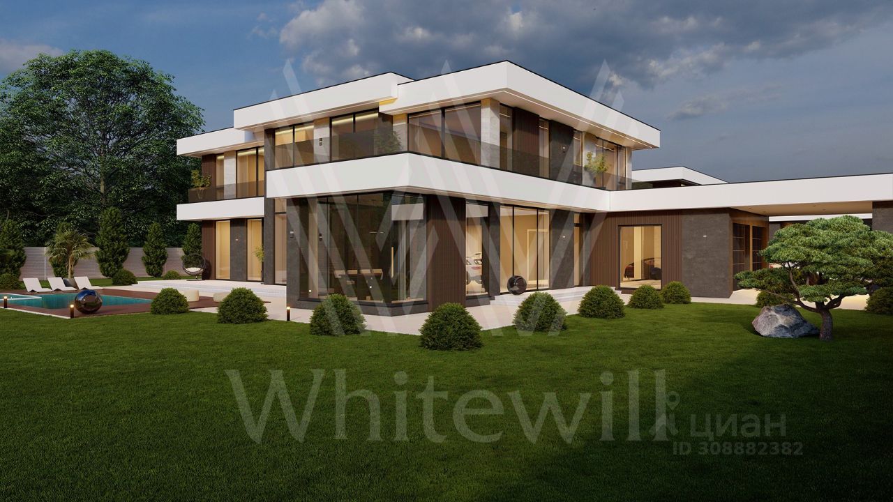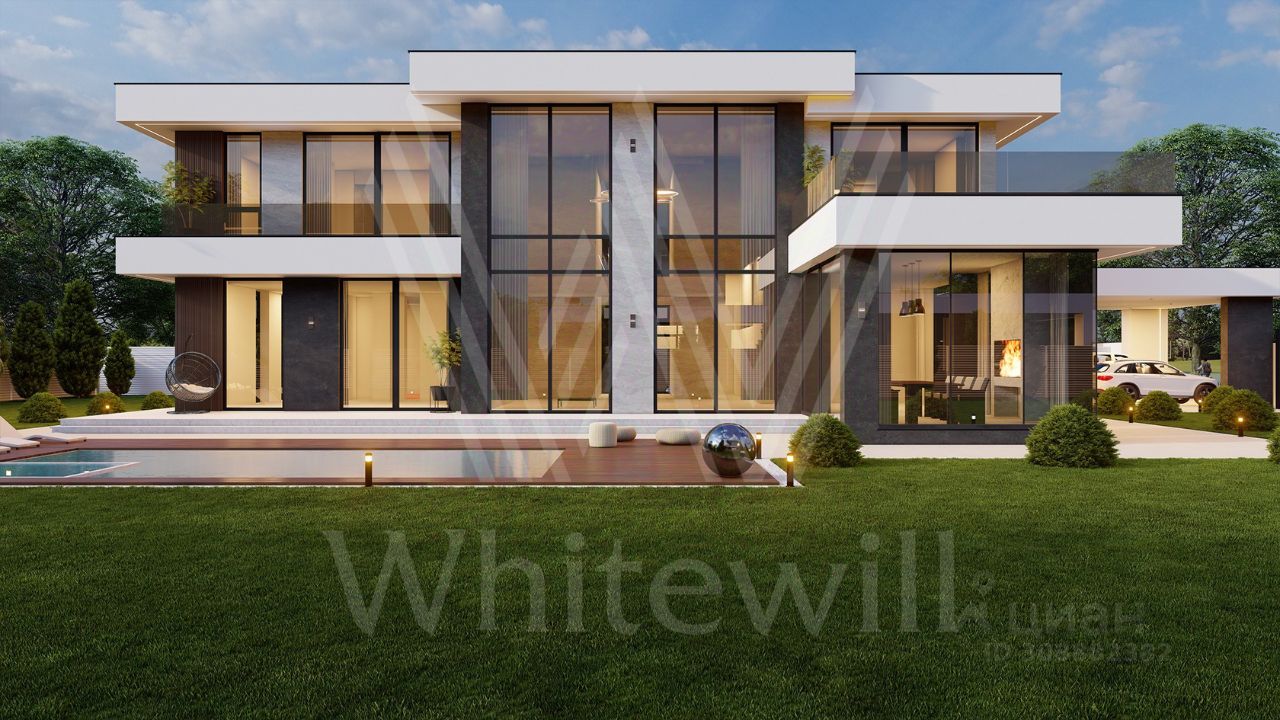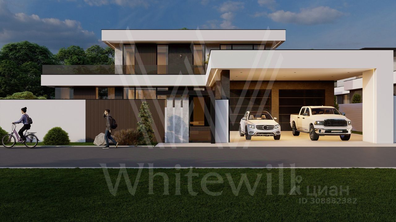 ID 12 902. Райт Хиллс. Новый загородный дом площадью 621 м² расположен на ровном участке 21 сотка. Расположение в поселке - самая высокая точка. Фасад с панорамными окнами выполнен в современном стиле и облицован итальянским керамогранитом Laminam, немецкой декоративной штукатуркой StoMarlit и декорирован рейками из мореного дуба. Коттедж предлагается без отделки.
