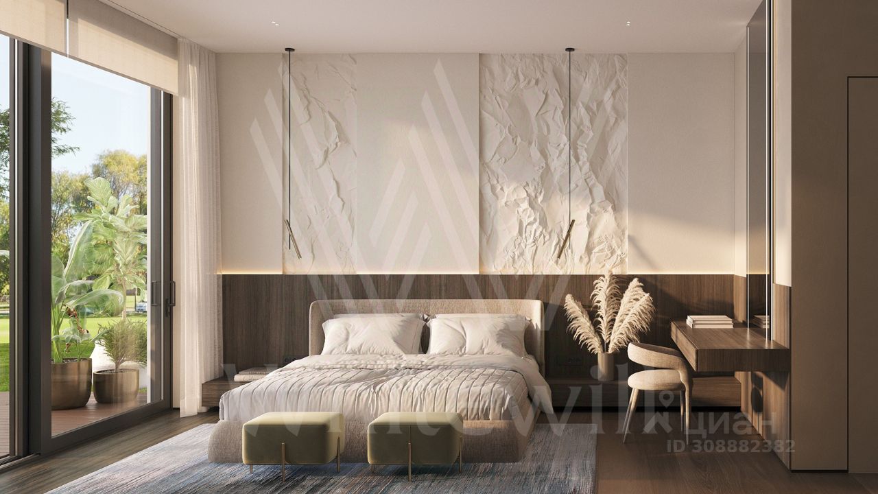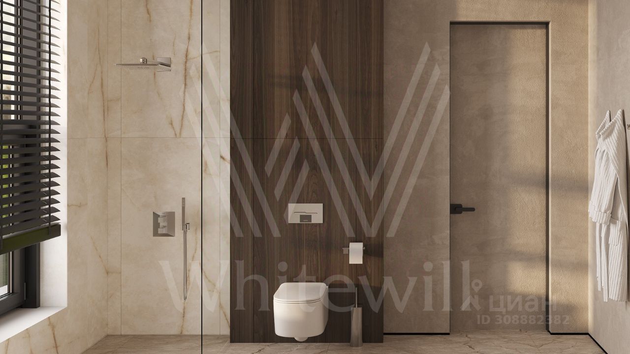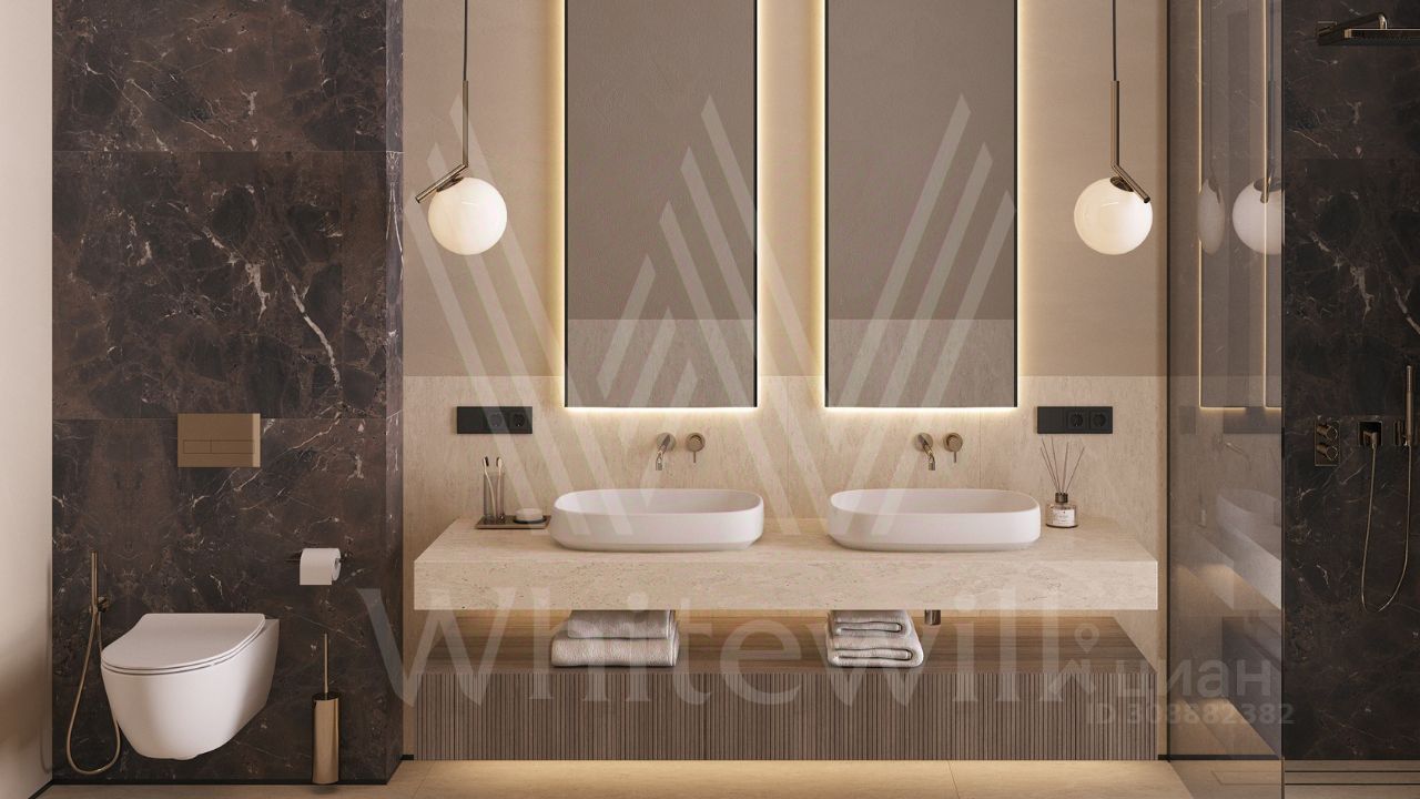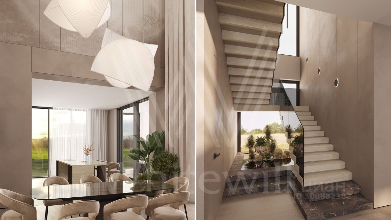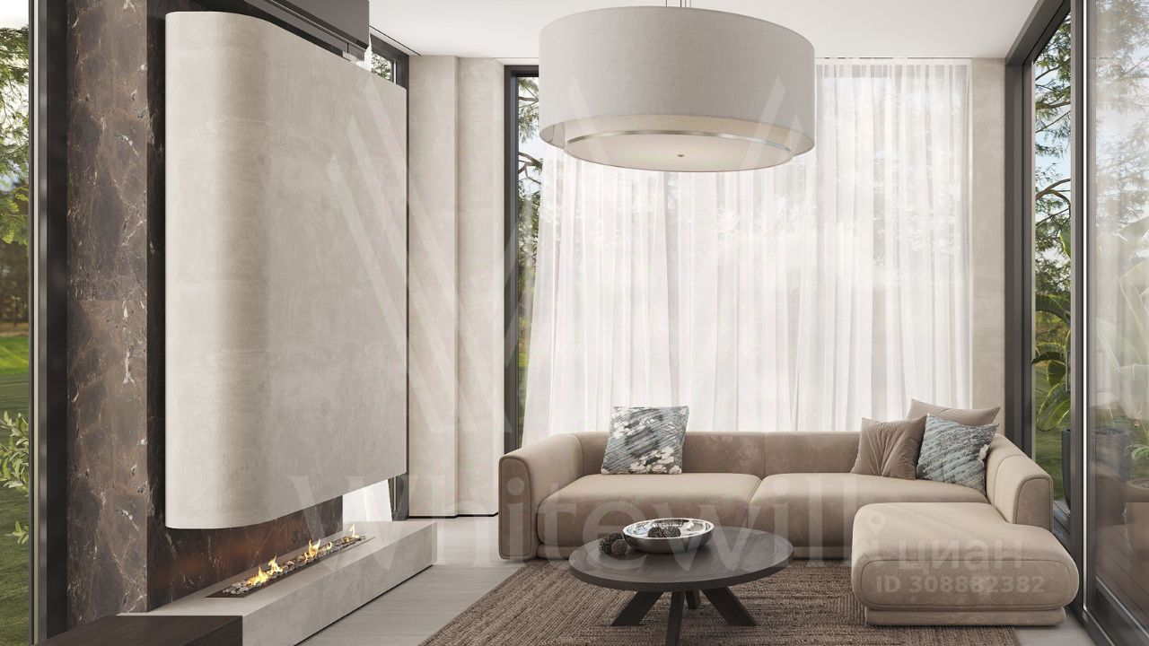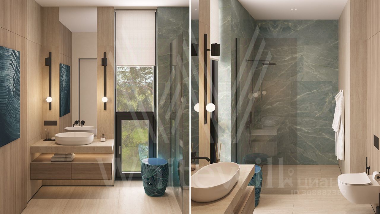 ID 12 902. Райт Хиллс. Новый загородный дом площадью 621 м² расположен на ровном участке 21 сотка. Расположение в поселке - самая высокая точка. Фасад с панорамными окнами выполнен в современном стиле и облицован итальянским керамогранитом Laminam, немецкой декоративной штукатуркой StoMarlit и декорирован рейками из мореного дуба. Коттедж предлагается без отделки.