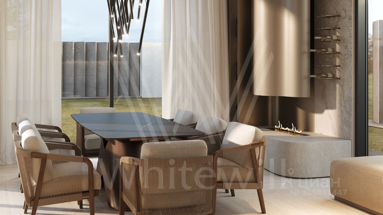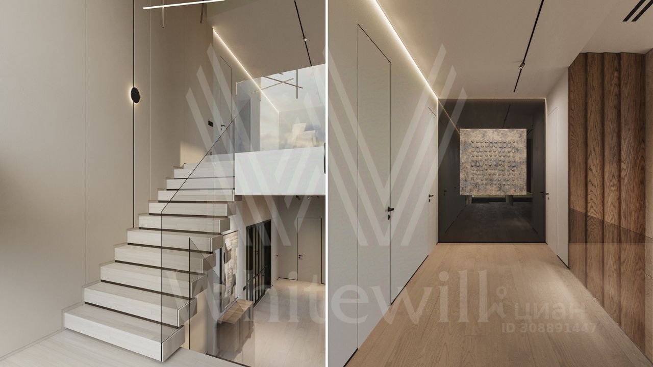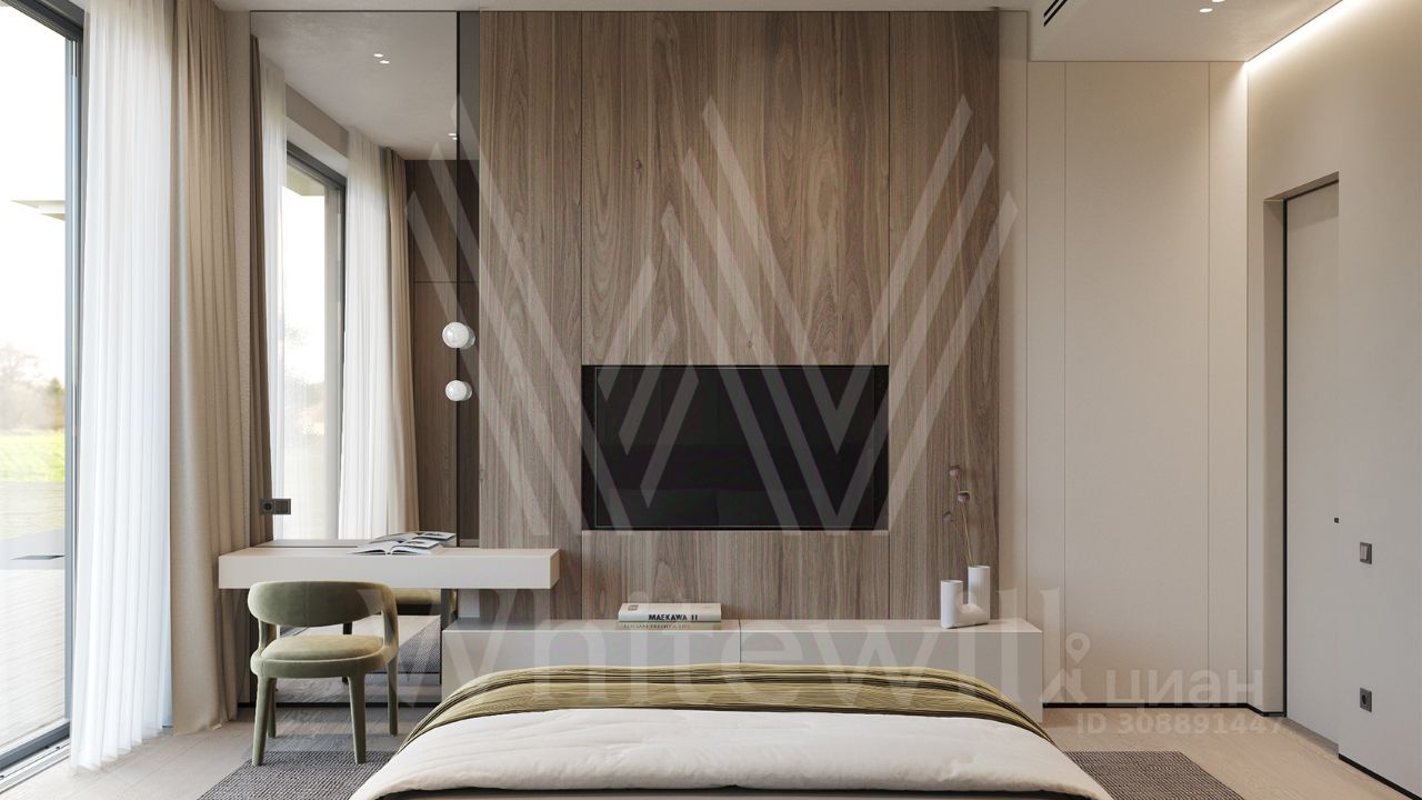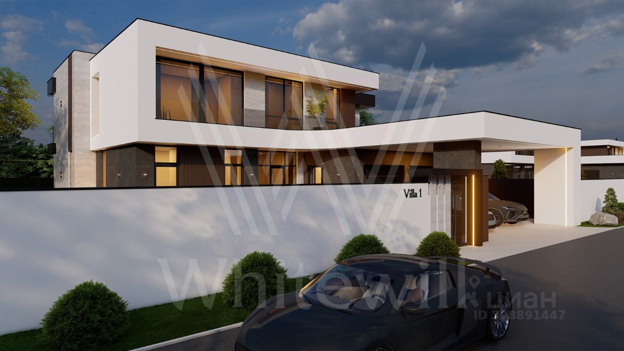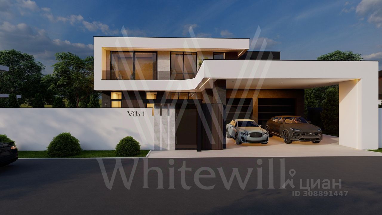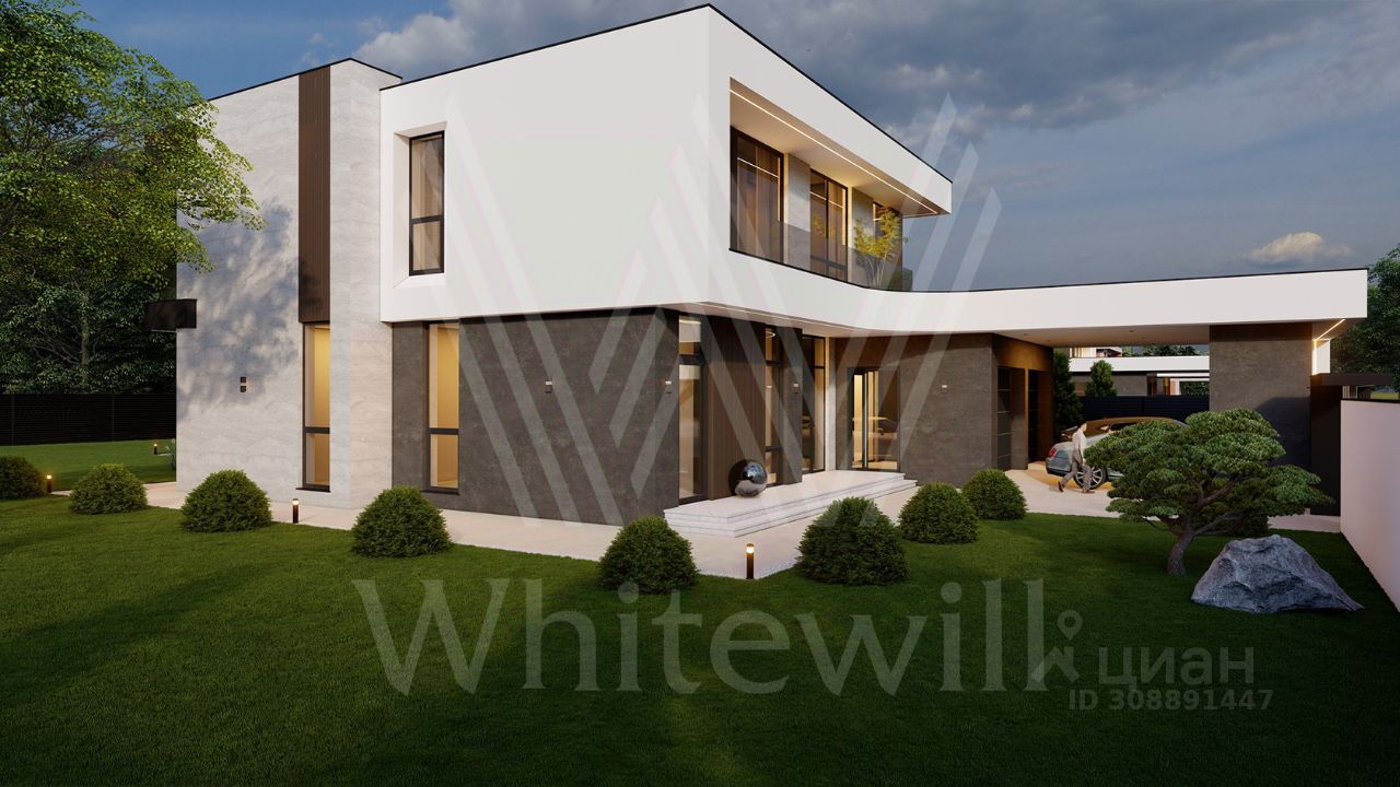 ID 12 903. Райт Хиллс. Новый загородный дом площадью 435 м² расположен на ровном участке 17 соток. Расположение в поселке - самая высокая точка. Фасад с панорамными окнами выполнен в современном стиле и облицован итальянским керамогранитом Laminam, немецкой декоративной штукатуркой StoMarlit и декорирован рейками из мореного дуба. Коттедж предлагается с отделкой под ''тапочки''. Будет сдан в марте 2025г.