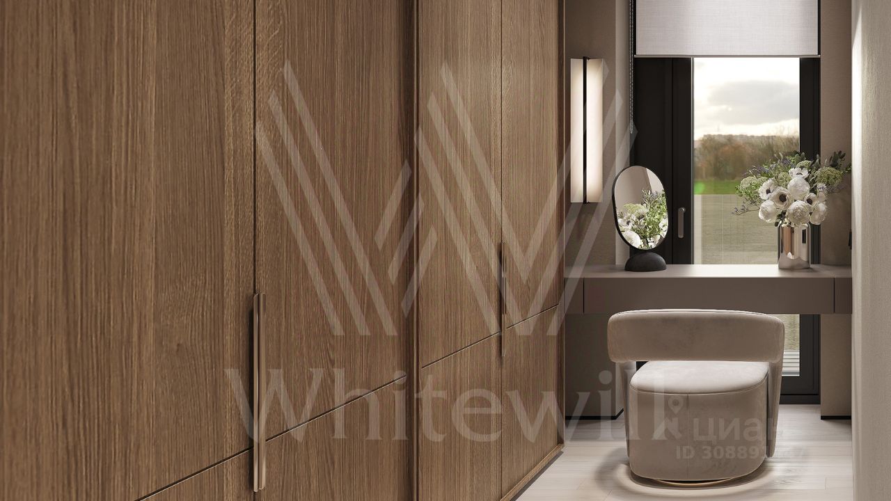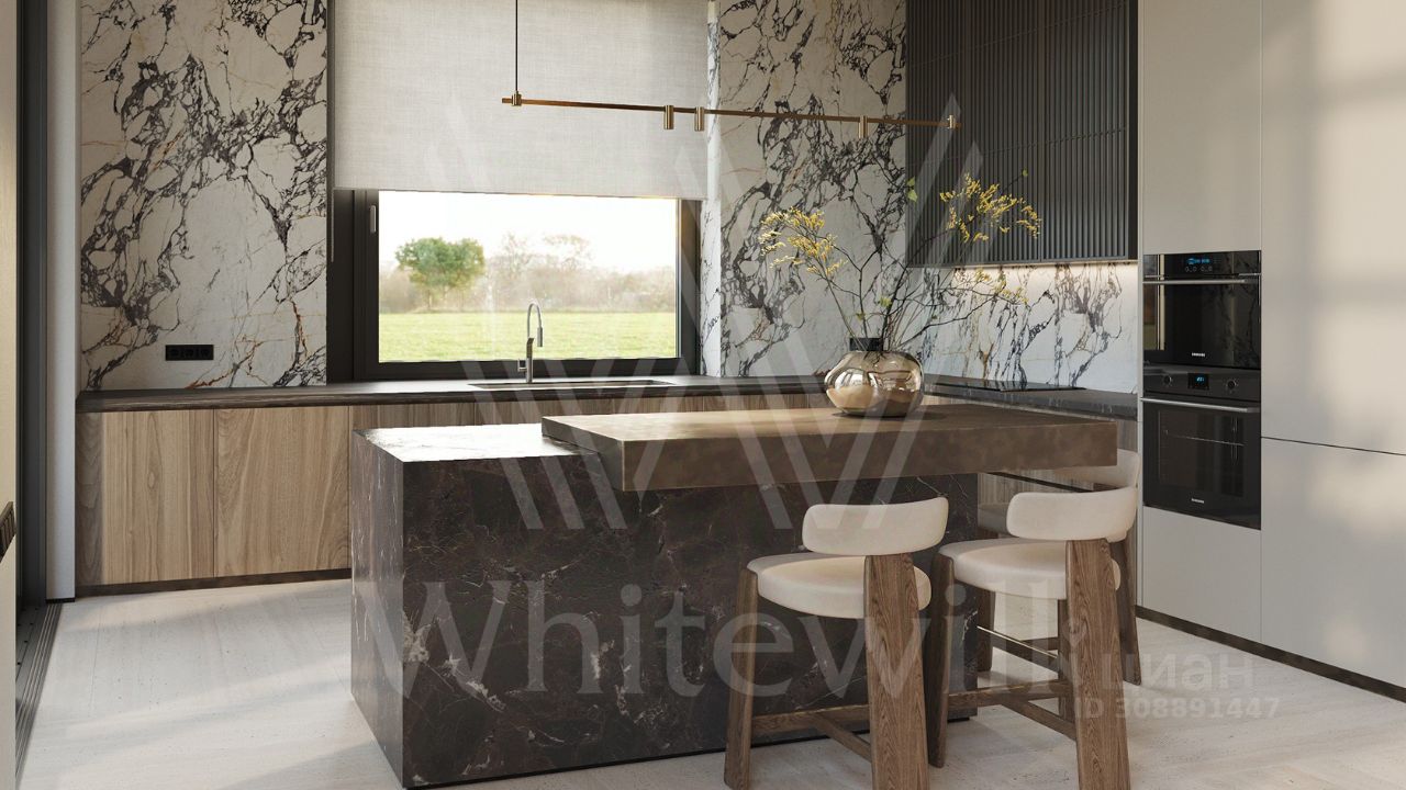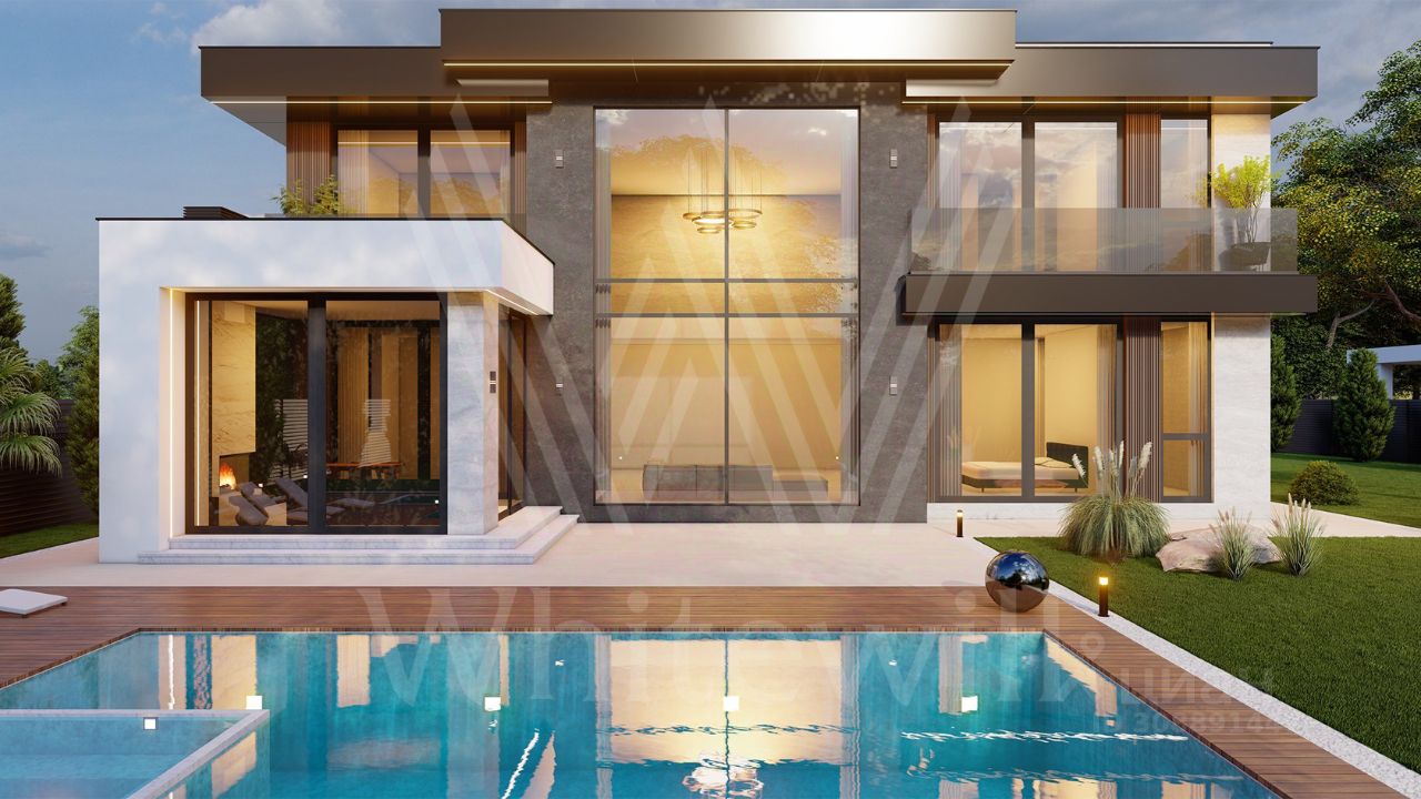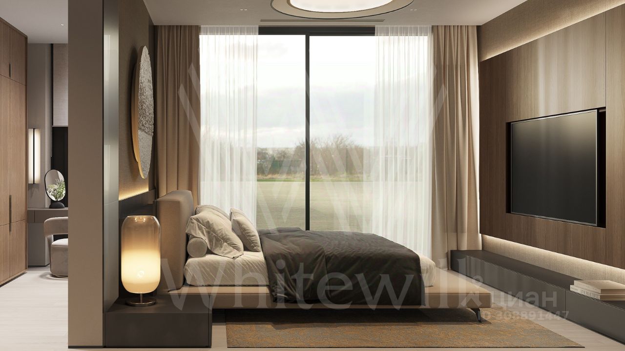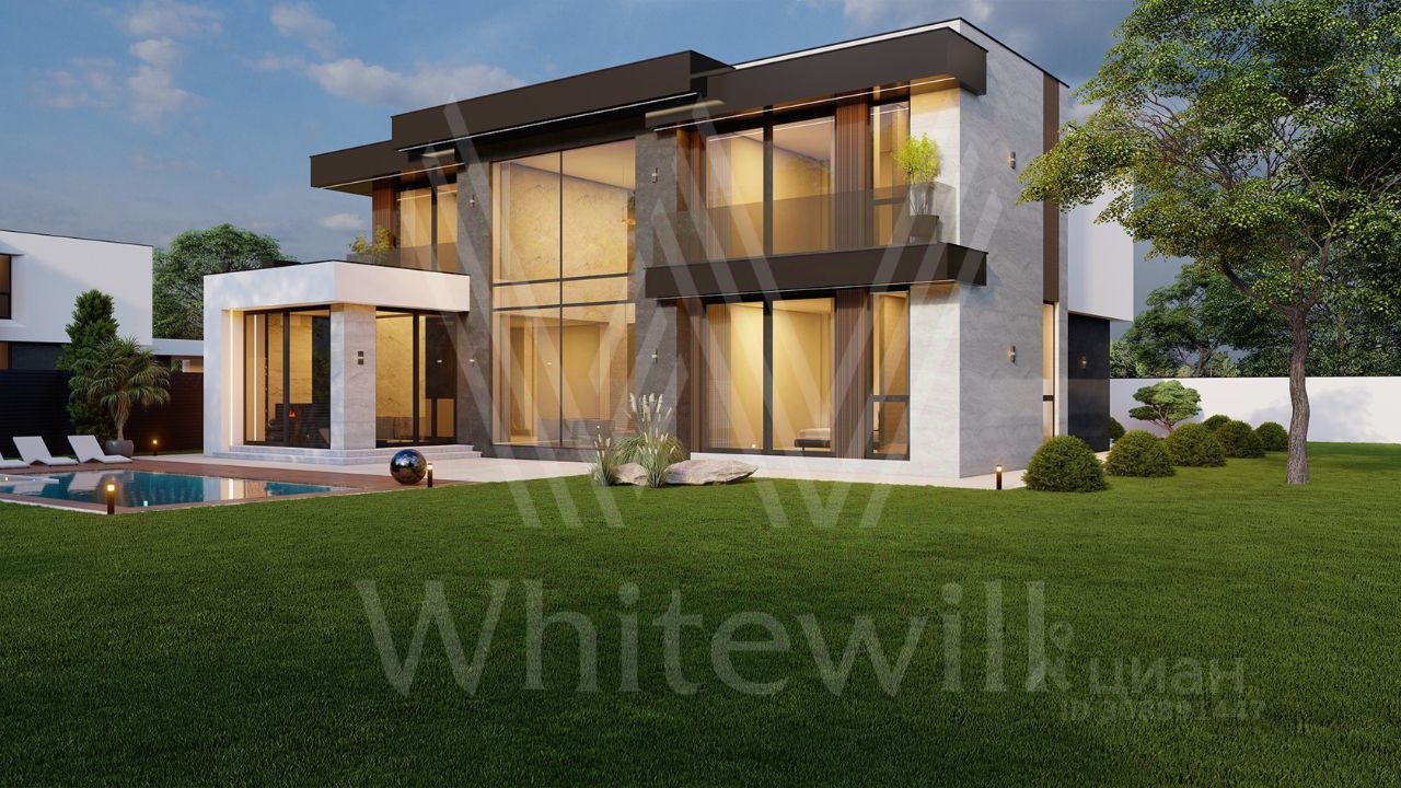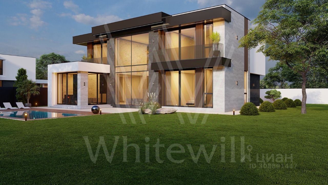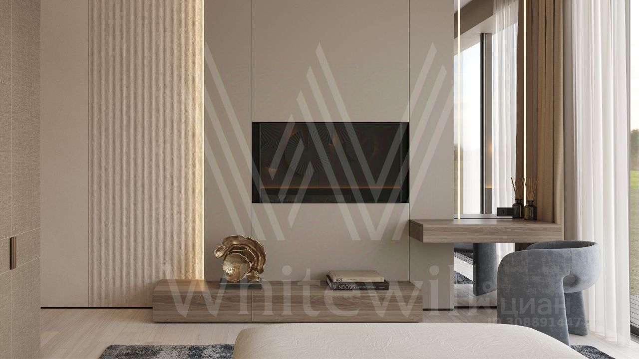 ID 12 903. Райт Хиллс. Новый загородный дом площадью 435 м² расположен на ровном участке 17 соток. Расположение в поселке - самая высокая точка. Фасад с панорамными окнами выполнен в современном стиле и облицован итальянским керамогранитом Laminam, немецкой декоративной штукатуркой StoMarlit и декорирован рейками из мореного дуба. Коттедж предлагается с отделкой под ''тапочки''. Будет сдан в марте 2025г.