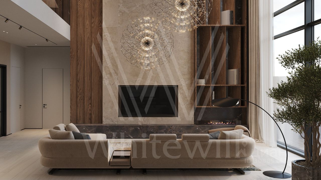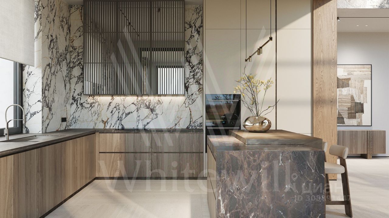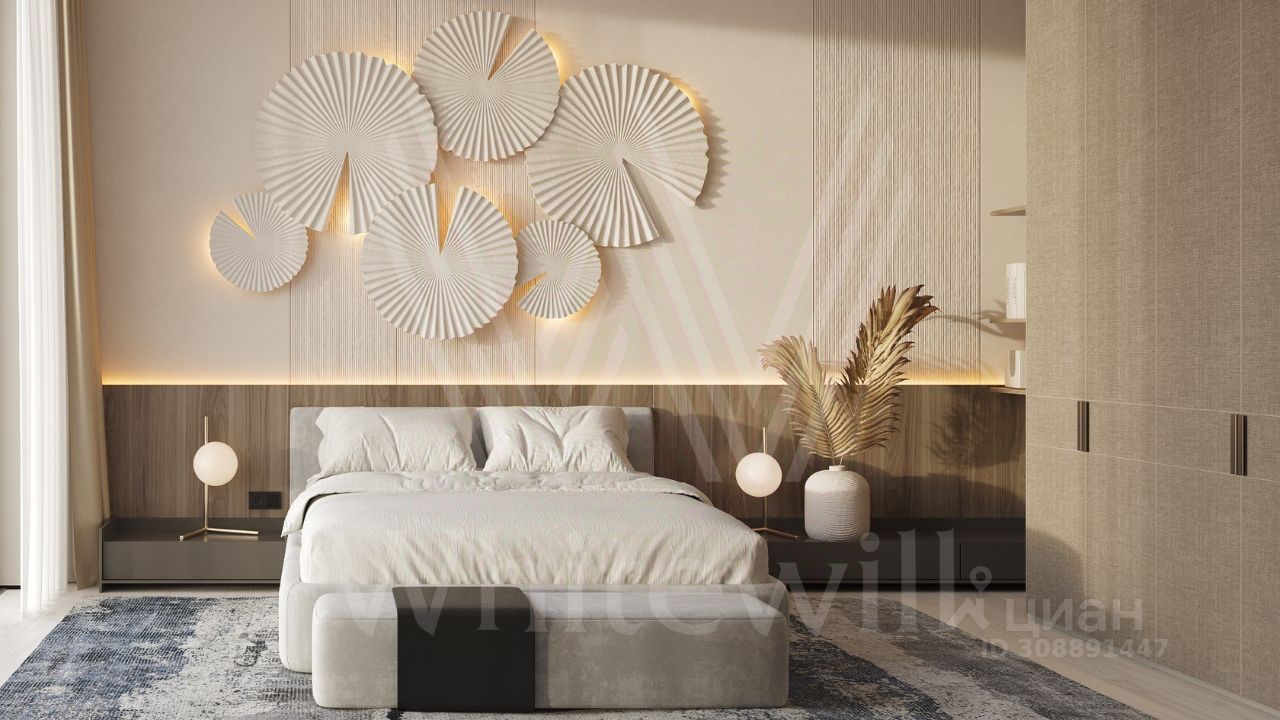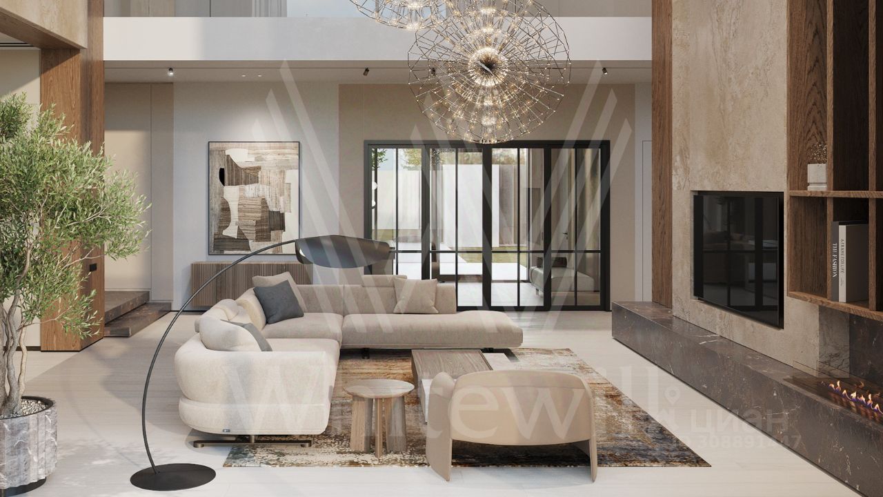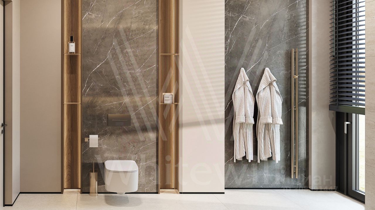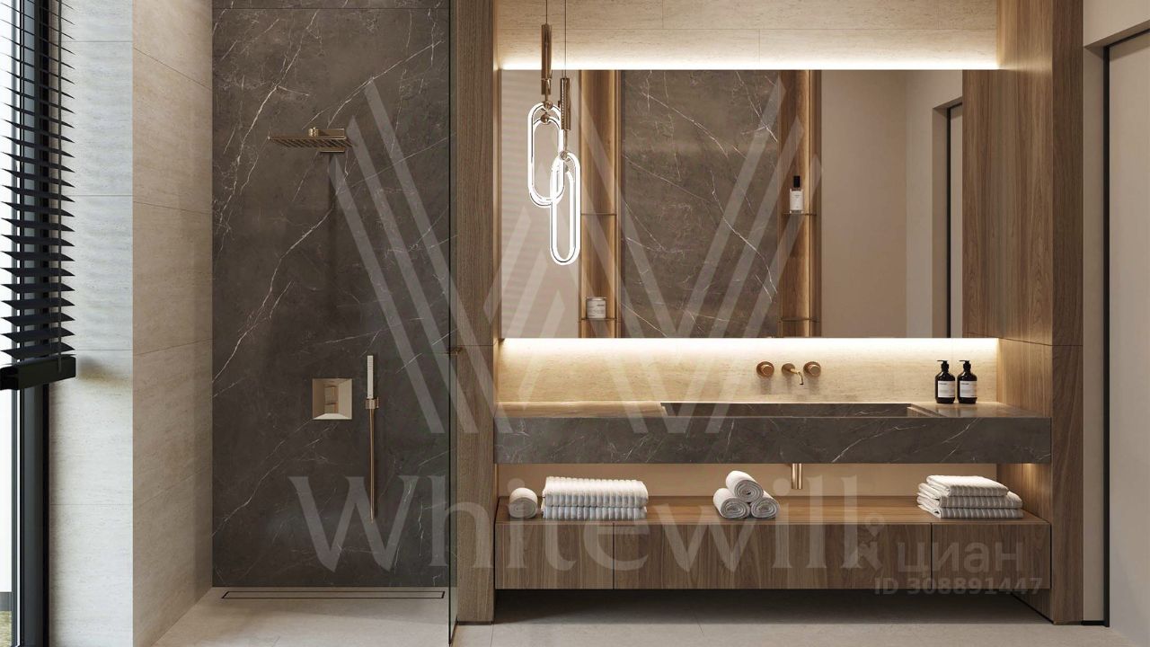 ID 12 903. Райт Хиллс. Новый загородный дом площадью 435 м² расположен на ровном участке 17 соток. Расположение в поселке - самая высокая точка. Фасад с панорамными окнами выполнен в современном стиле и облицован итальянским керамогранитом Laminam, немецкой декоративной штукатуркой StoMarlit и декорирован рейками из мореного дуба. Коттедж предлагается с отделкой под ''тапочки''. Будет сдан в марте 2025г.