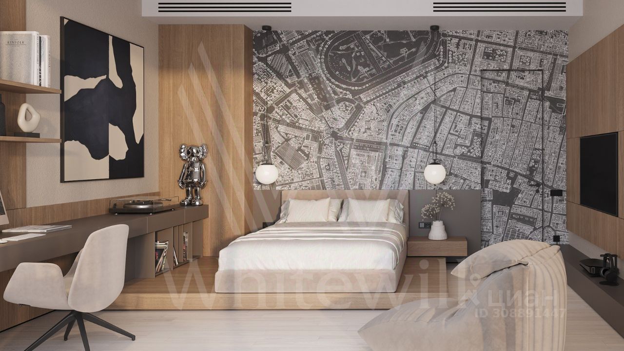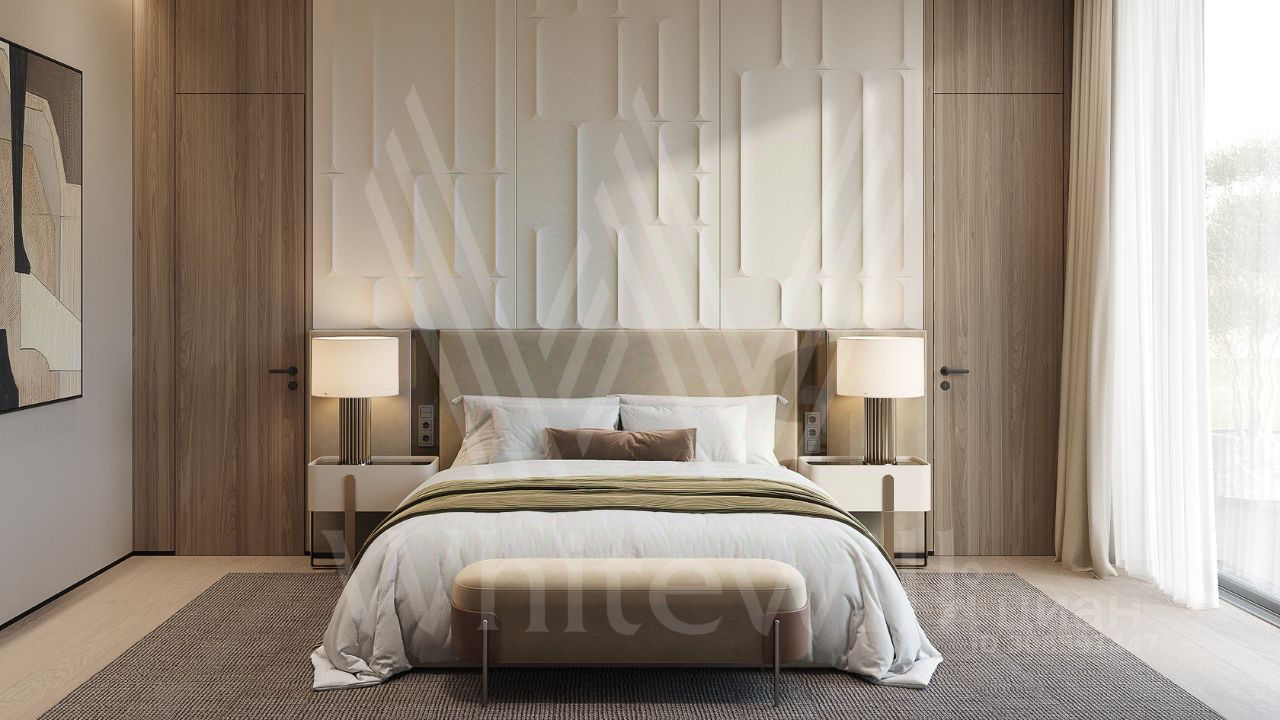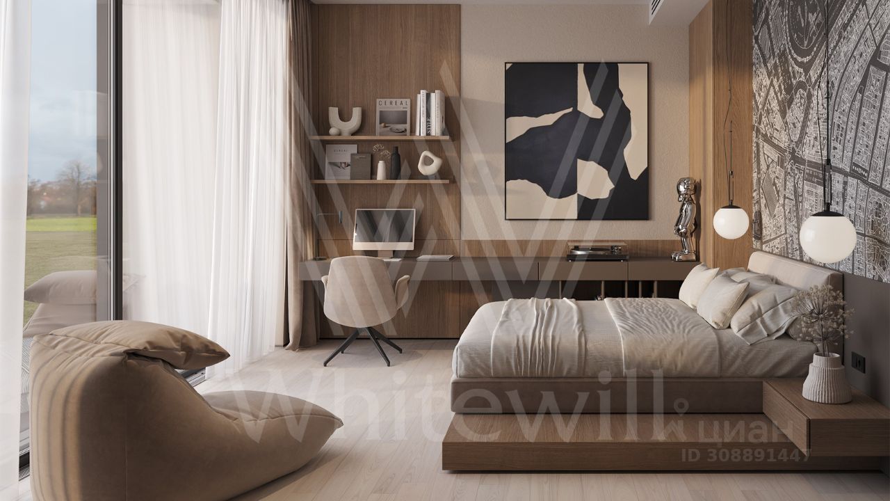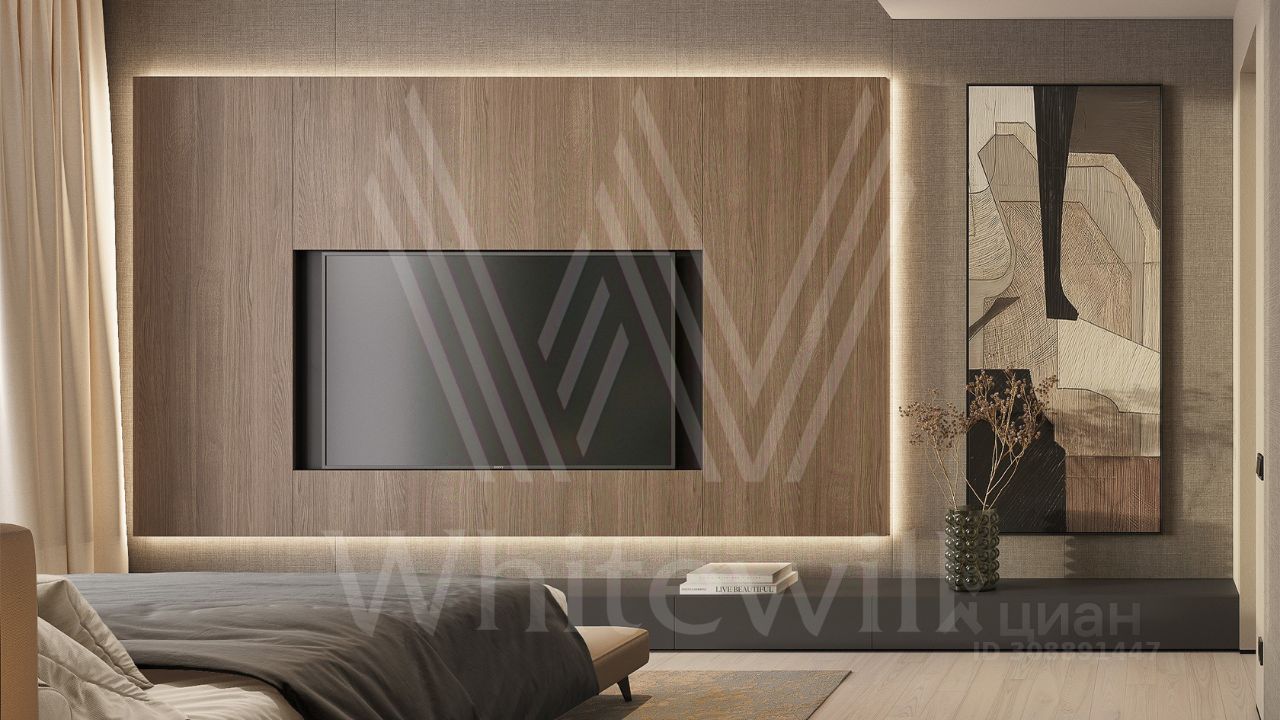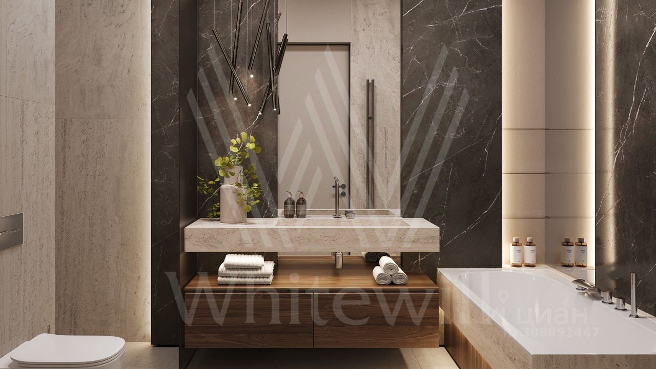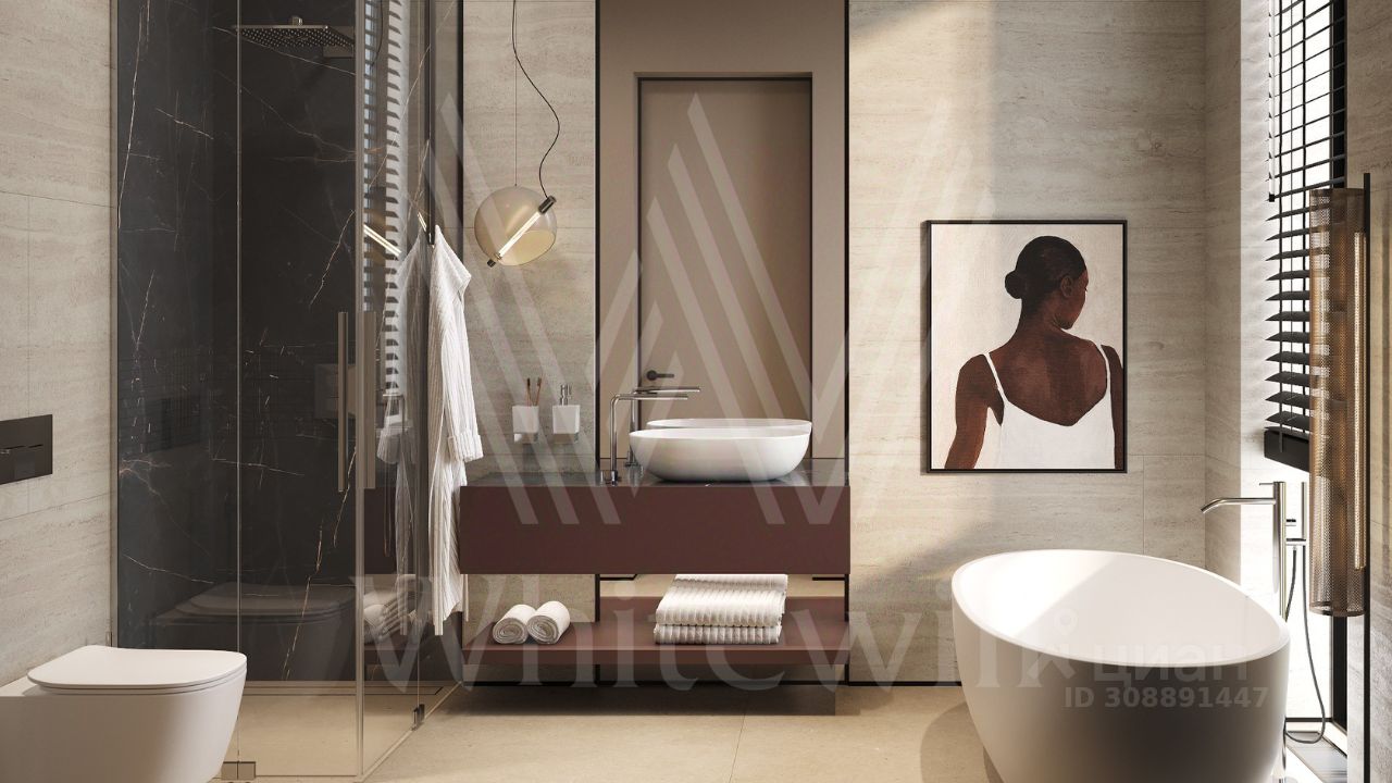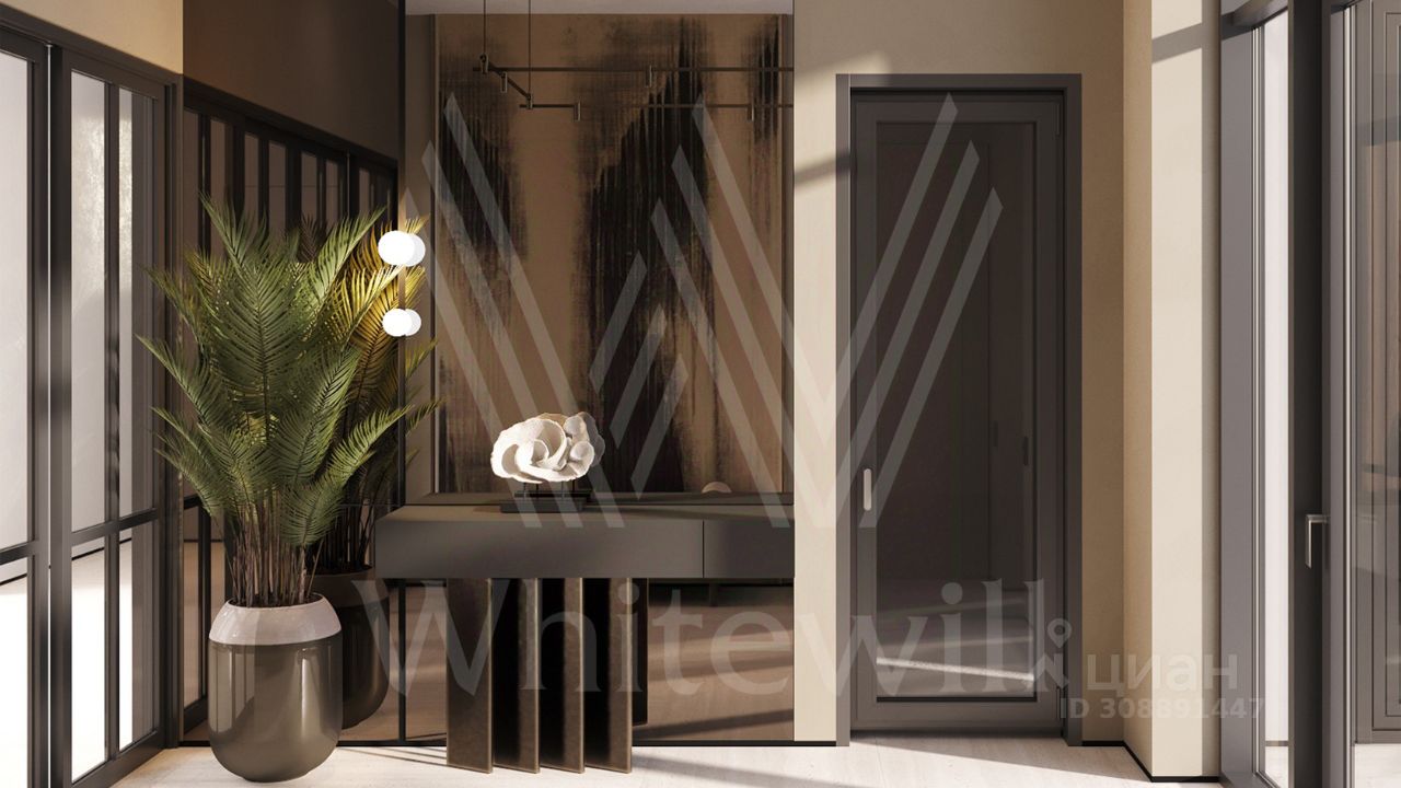 ID 12 903. Райт Хиллс. Новый загородный дом площадью 435 м² расположен на ровном участке 17 соток. Расположение в поселке - самая высокая точка. Фасад с панорамными окнами выполнен в современном стиле и облицован итальянским керамогранитом Laminam, немецкой декоративной штукатуркой StoMarlit и декорирован рейками из мореного дуба. Коттедж предлагается с отделкой под ''тапочки''. Будет сдан в марте 2025г.