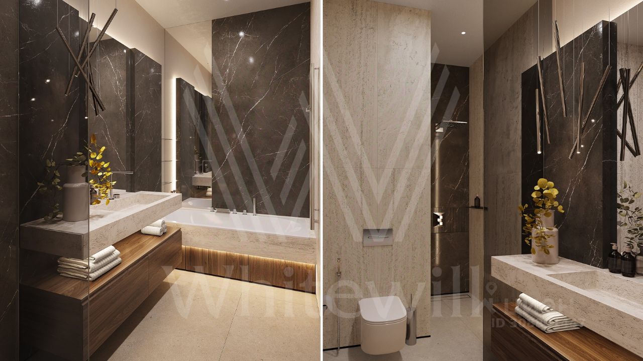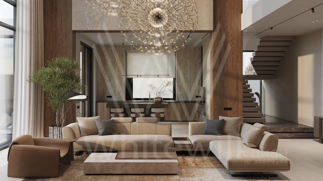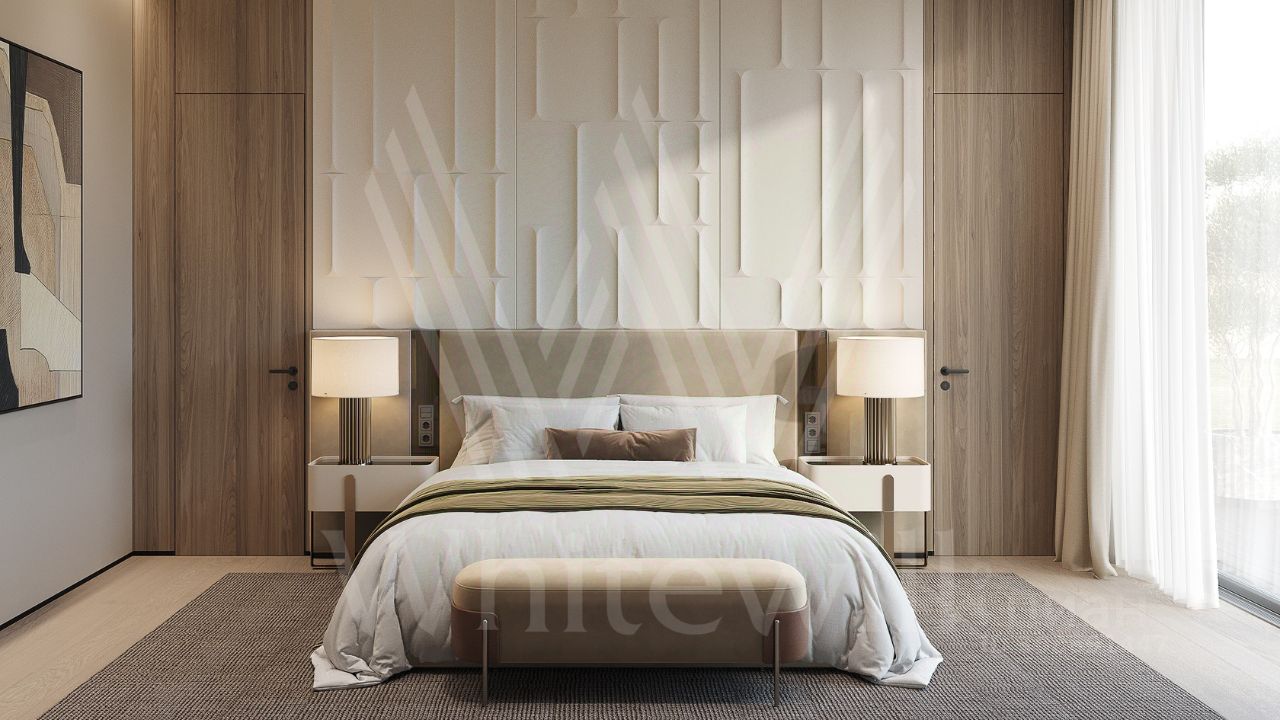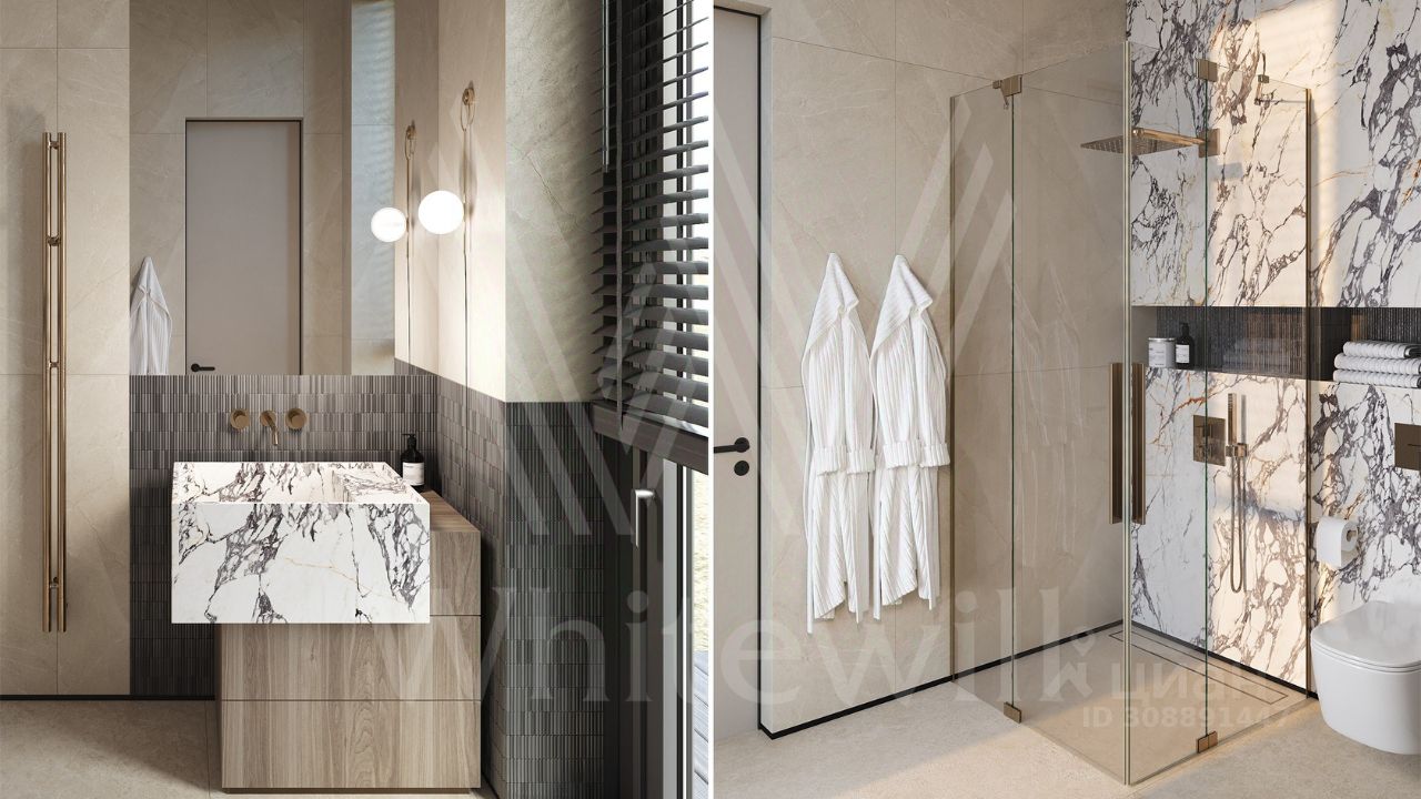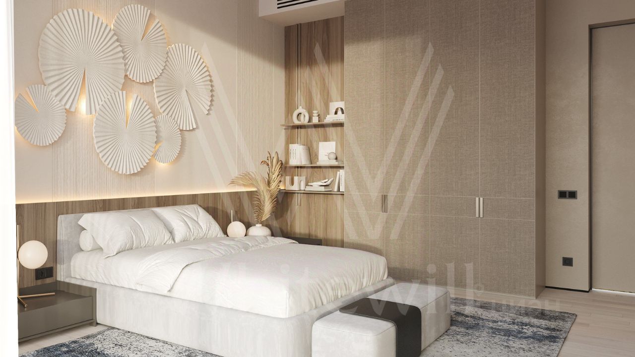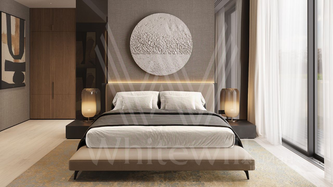 ID 12 903. Райт Хиллс. Новый загородный дом площадью 435 м² расположен на ровном участке 17 соток. Расположение в поселке - самая высокая точка. Фасад с панорамными окнами выполнен в современном стиле и облицован итальянским керамогранитом Laminam, немецкой декоративной штукатуркой StoMarlit и декорирован рейками из мореного дуба. Коттедж предлагается с отделкой под ''тапочки''. Будет сдан в марте 2025г.