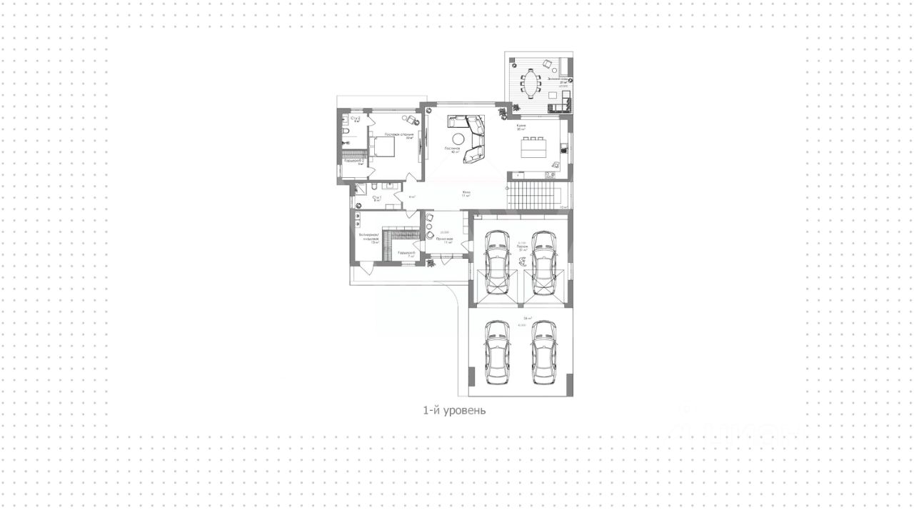 Поэтажное описание 1-й уровень: прихожая, гардеробная, гостиная-кухня-столовая, санузел, спальня с гардеробной и санузлом, бойлерная, зимний сад, гараж.