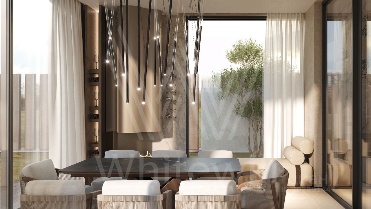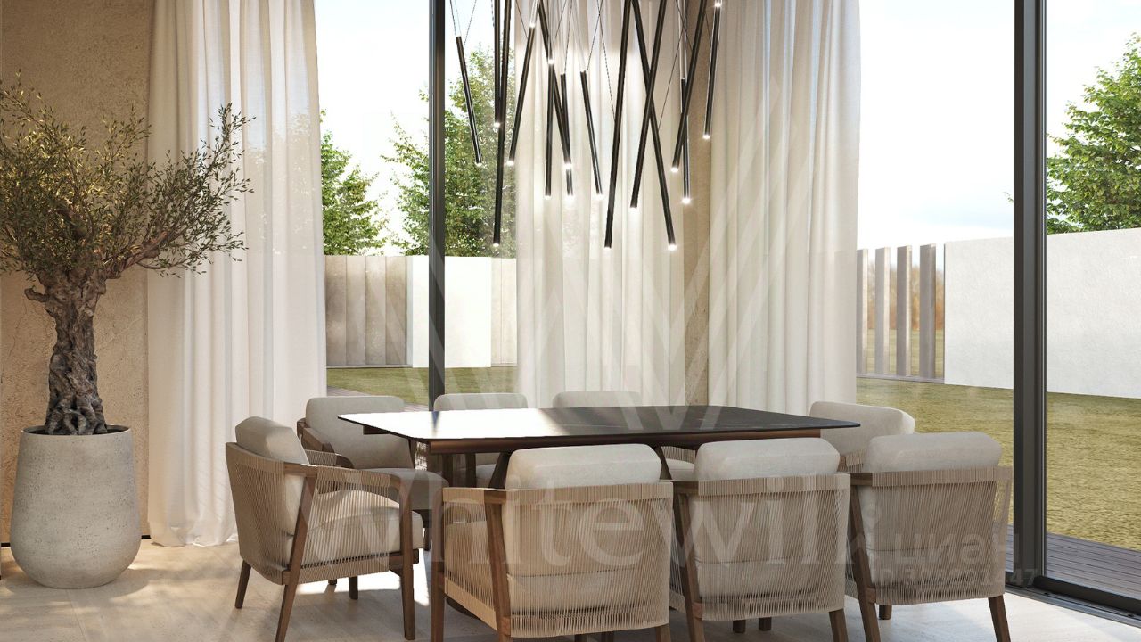 В доме спланировали просторную гостиную со вторым светом в 7 метров, гостиную-столовую, зимний сад, 4 спальни, 4 гардеробных, зимний сад. Дополнительно спроектированы террасы, для которых использовано деревянное покрытие от шведского производителя CM Decking BARK. Высота потолков на 1-м этаже 3,3м, на втором- 3,2м Из-за большой площади остекления в доме установлены усиленные профили Шуко. Все окна с проветриванием без горизонтальных перемычек. Также в контуре дома предусмотрен гараж на 2 машины с остеклением, монолитный навес на 2 машиноместа, шириной 8 метров. На участке будут выполнены ландшафтные работы: газон, 6-метровые деревья -туи и ели, автополив. Продумано все по инсоляции и правильной посадки дома на участке.