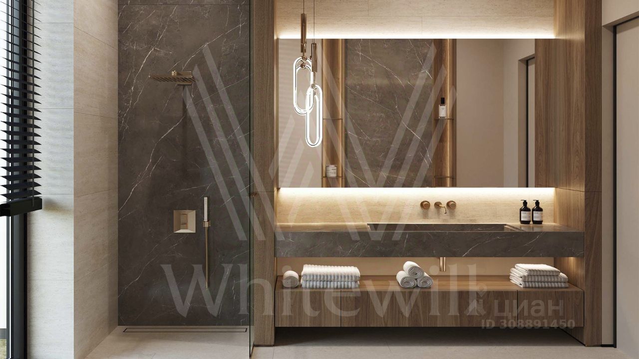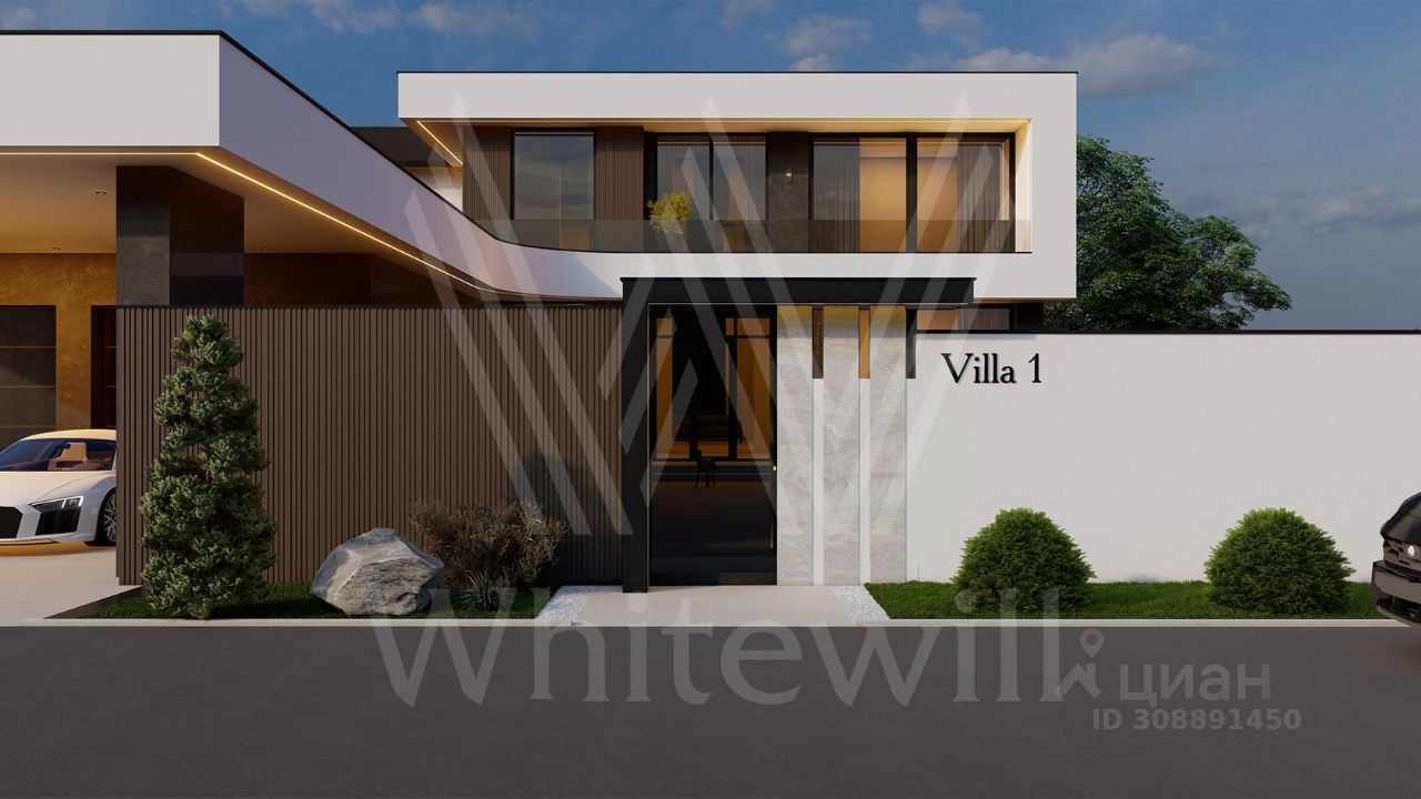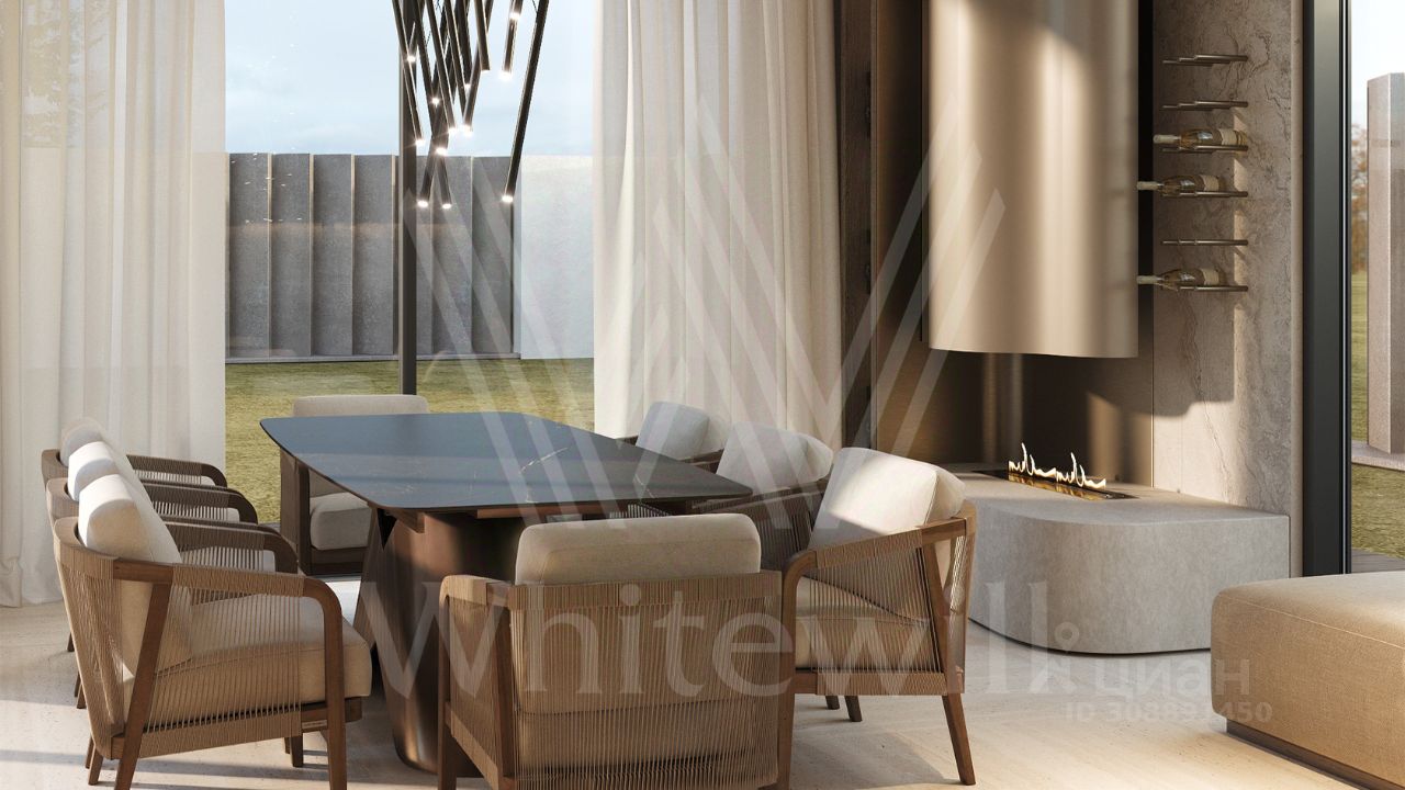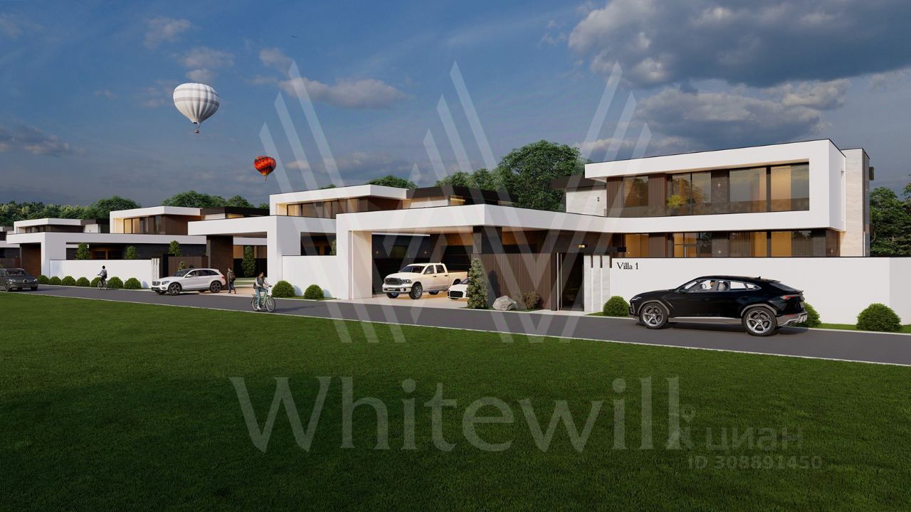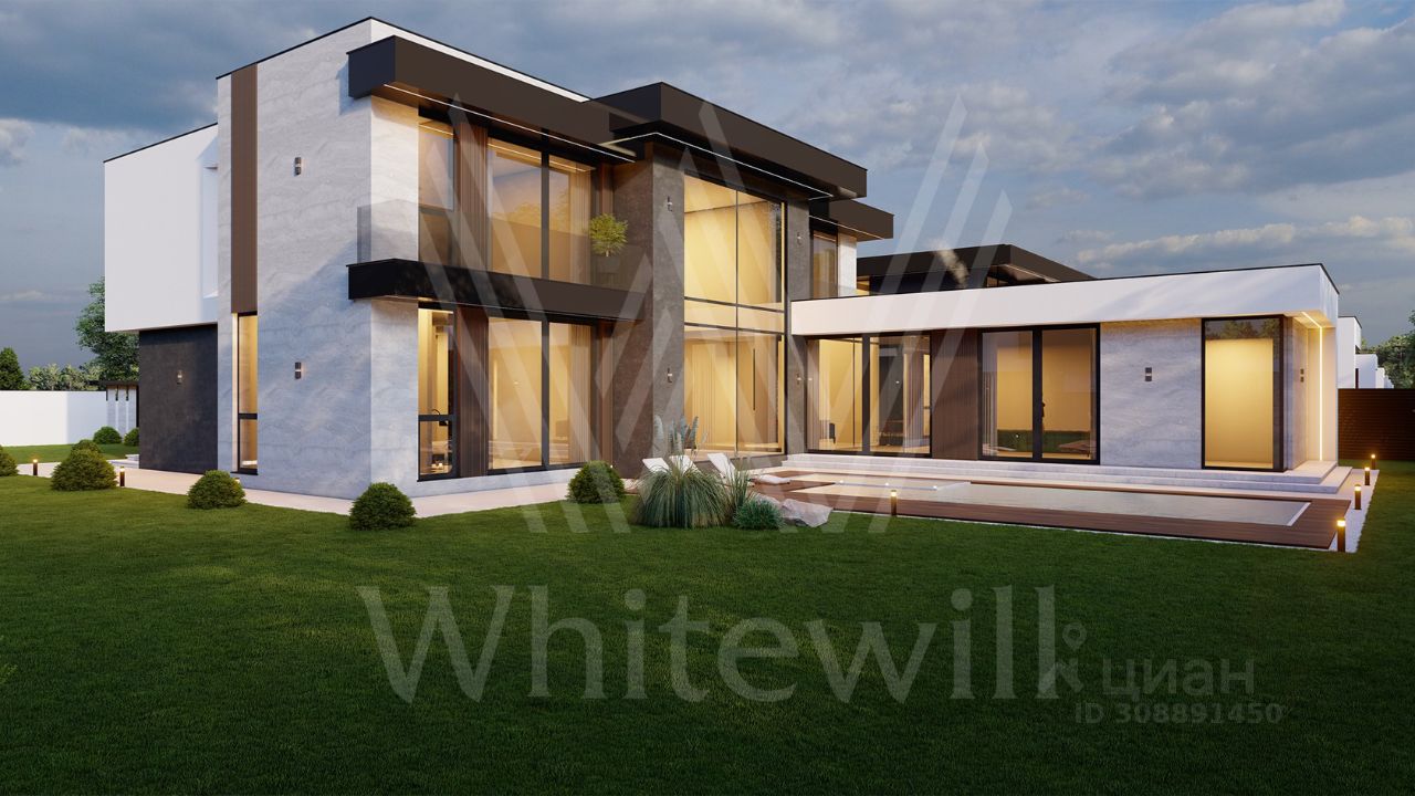 ID 12 904. Райт Хиллс. Новый загородный дом площадью 550 м², расположен на ровном участке 21,6 соток. Расположение в поселке- самая высокая точка. Фасад с панорамными окнами выполнен в современном стиле и облицован итальянским керамогранитом Laminam, немецкой декоративной штукатуркой StoMarlit и декорирован рейками из мореного дуба. Коттедж предлагается без отделки.
