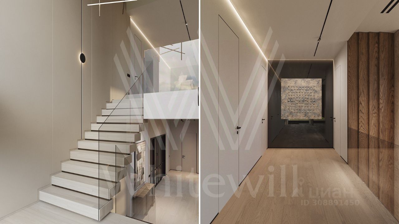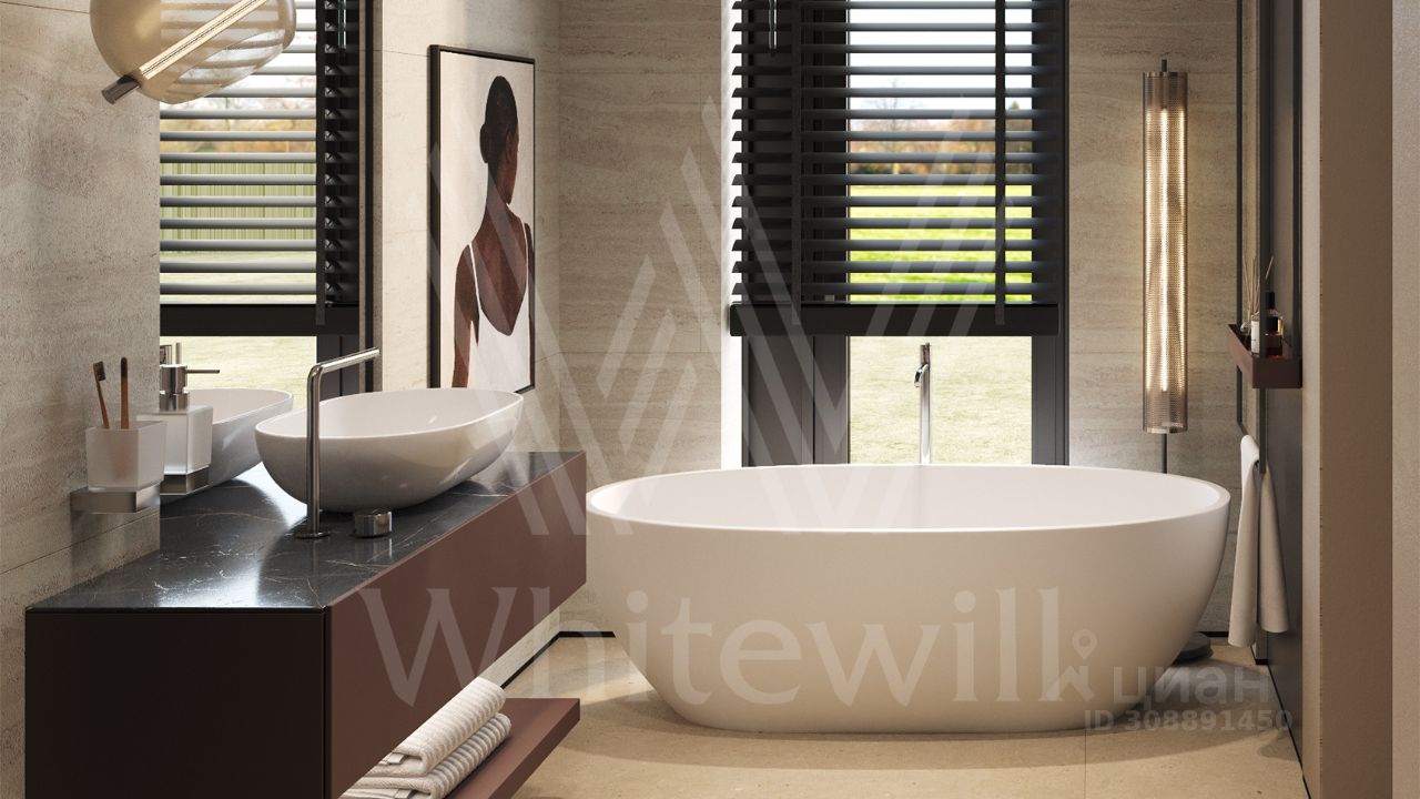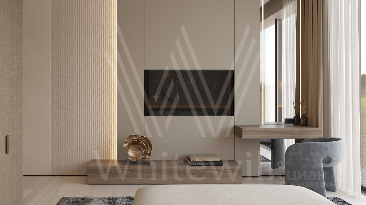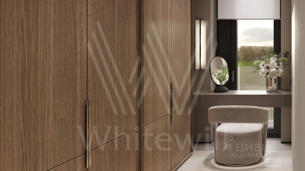 ID 12 904. Райт Хиллс. Новый загородный дом площадью 550 м², расположен на ровном участке 21,6 соток. Расположение в поселке- самая высокая точка. Фасад с панорамными окнами выполнен в современном стиле и облицован итальянским керамогранитом Laminam, немецкой декоративной штукатуркой StoMarlit и декорирован рейками из мореного дуба. Коттедж предлагается без отделки.