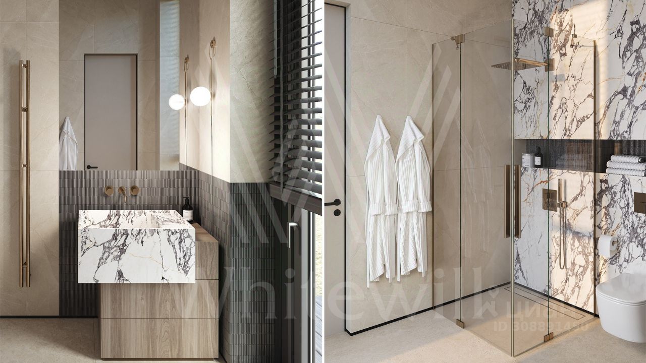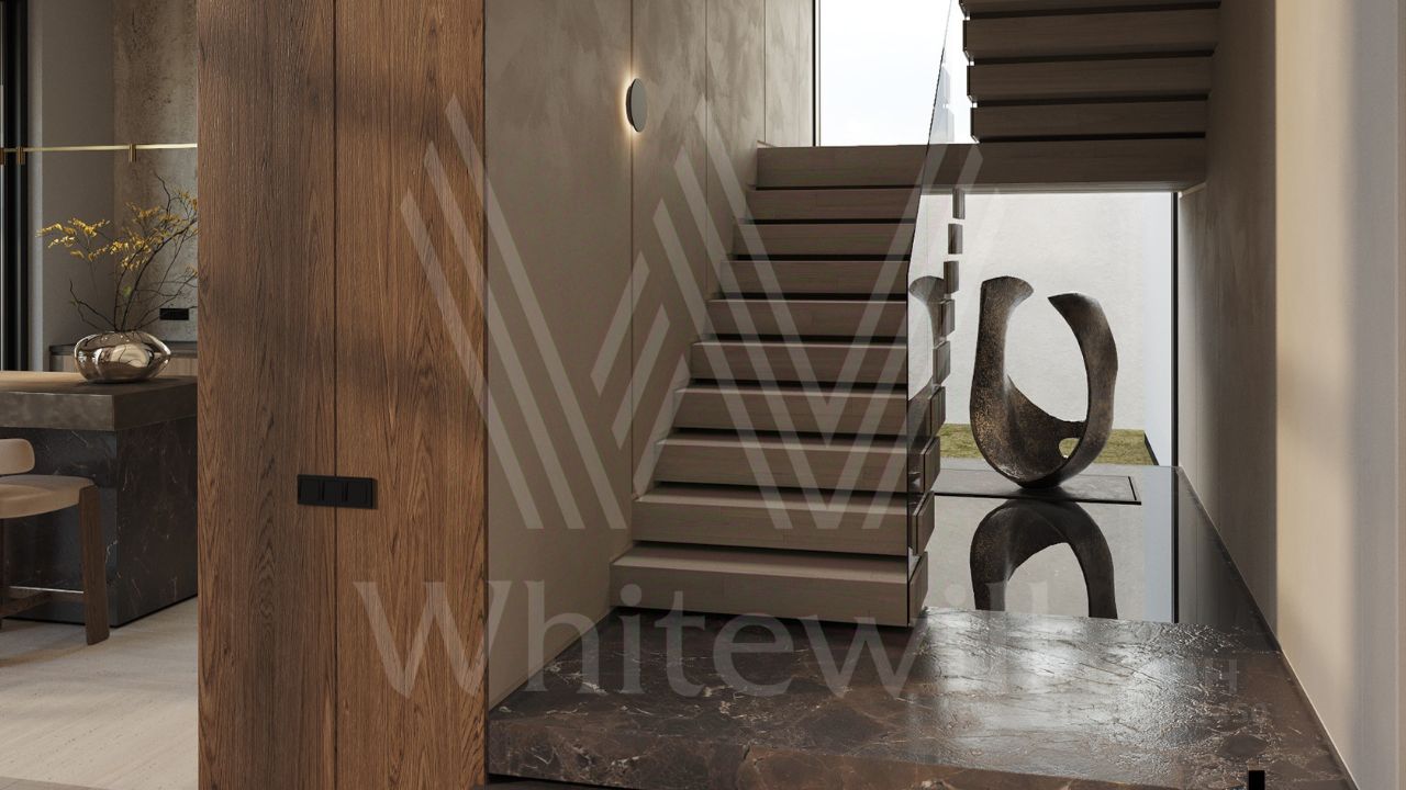 В доме спланировали просторную гостиную со вторым светом в 7 метров, гостиную-столовую, всего 4 спальни со своими санузлами, кабинет, SPA-зону с парной и комнатой отдыха, комнату для персонала с отдельным входом. Высота потолков на 1-м этаже 3,3м, на втором- 3,2м Из-за большой площади остекления в доме установлены усиленные профили Шуко.