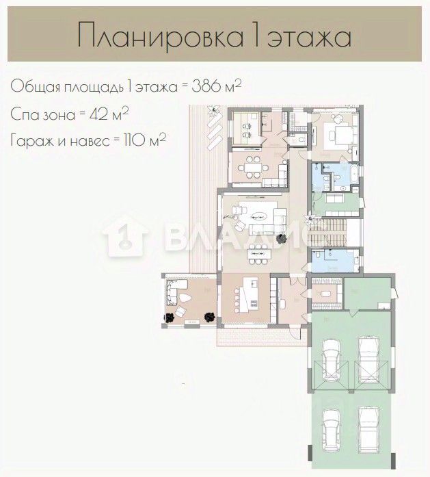 Общая площадь дома составляет 621 кв. м, из которых 446 кв. м приходится на жилую площадь. Кухня занимает 24 кв. м. Потолки высотой 3,3 м создают ощущение простора и свободы.