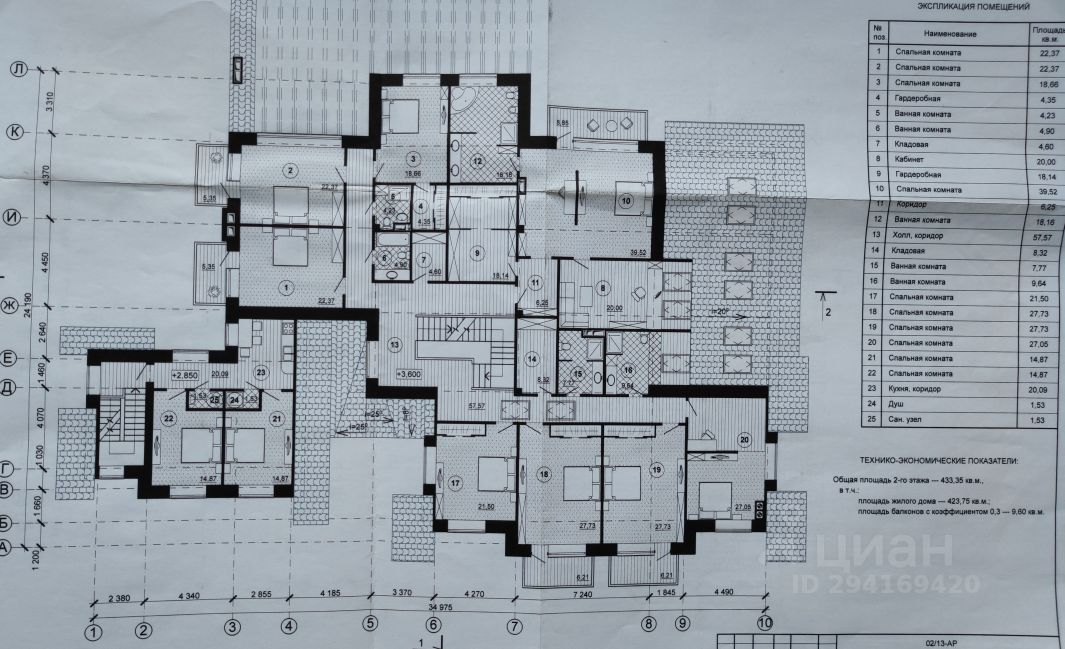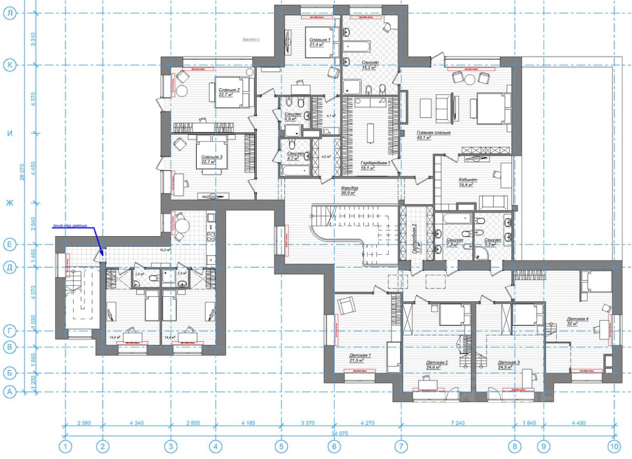 На втором этаже 434 м2 расположены: 4 мастер-спальни с санузлами, 4 спальни гостевых, кабинет, гардеробные. Отдельно со своим входом жилая зона персонала с 2 спальнями, кухней и санузлом.