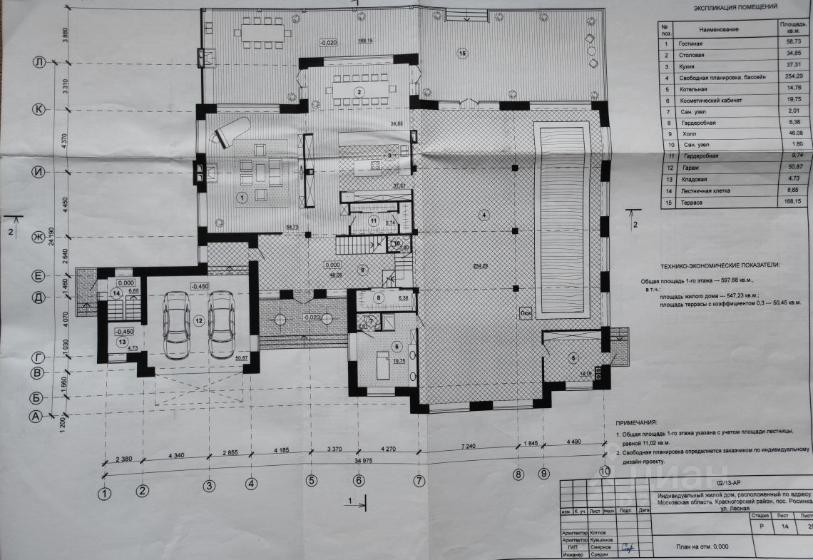 На первом этаже 598 м2 расположены: гостиная, столовая, кухня, бассейн, холл, гостиная, TV-зона, библиотека, кабинет, санузлы, гардеробные, гараж.