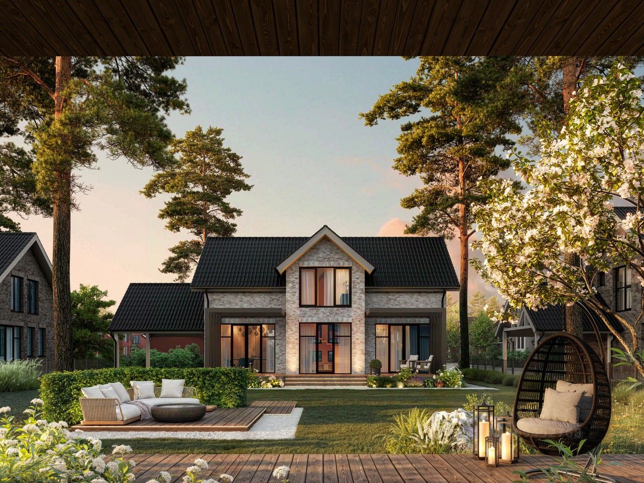 Уютный дом 71 площадью 180 кв. м. на участке 6 соток. Просторная планировка, современные материалы и панорамные окна.