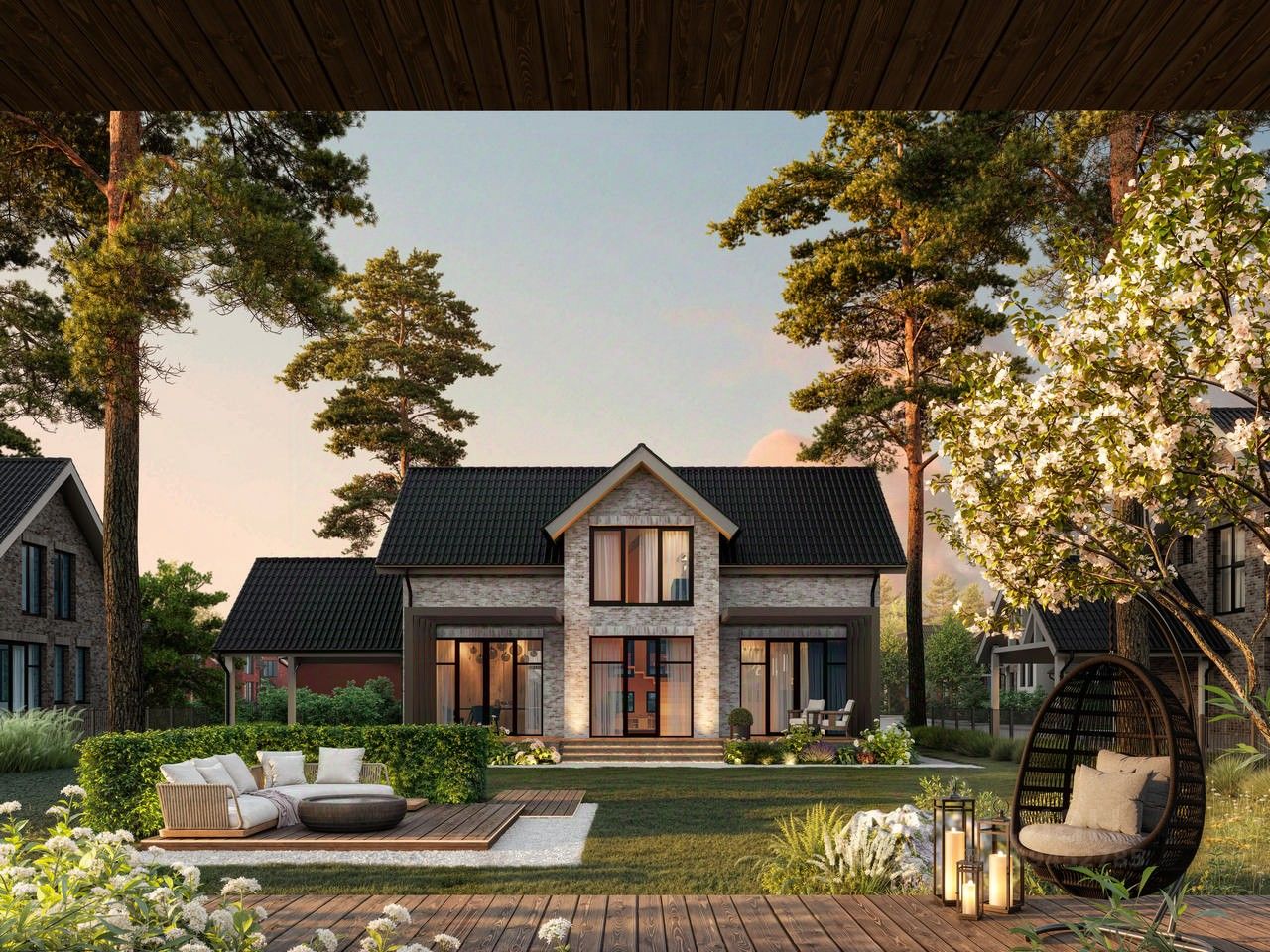 Уютный дом 108 площадью 120 кв. м. на участке 6 соток. Просторная планировка, современные материалы и панорамные окна.
