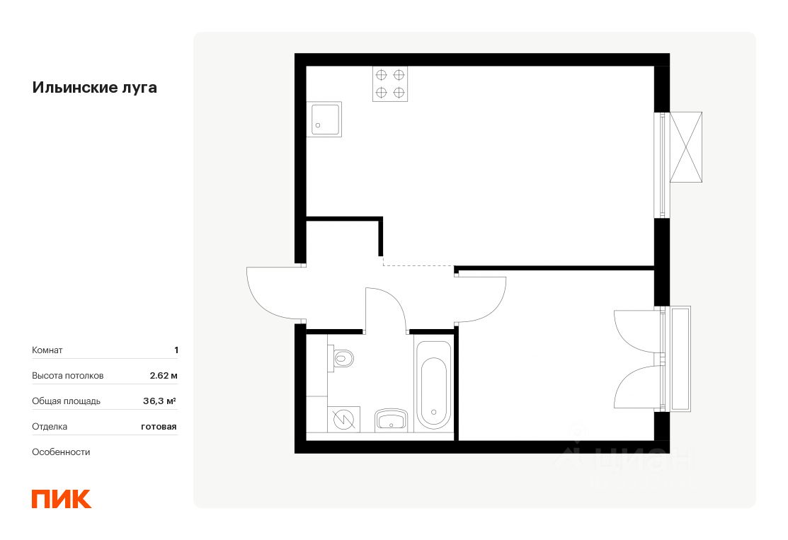Продаётся 1-комн. квартира площадью 36,3 кв.м на 4 этаже 9 этажного дома (Корпус 2.8, Секция 4) проекта ПИК Ильинские луга. Светлый просторный подъезд на уровне земли, функциональная планировка, большие окна, .