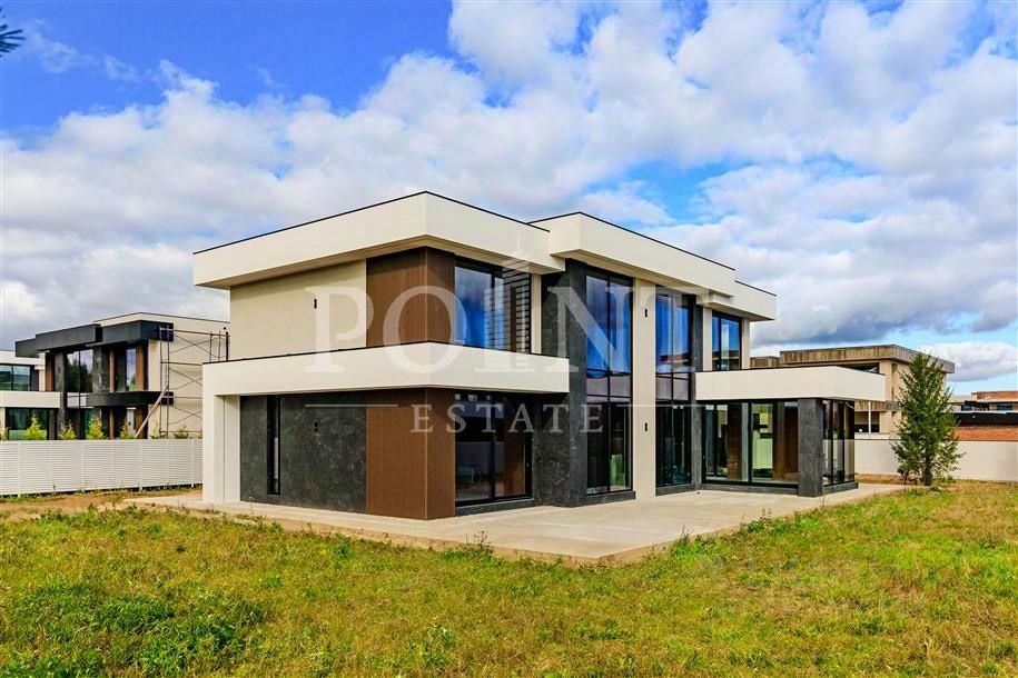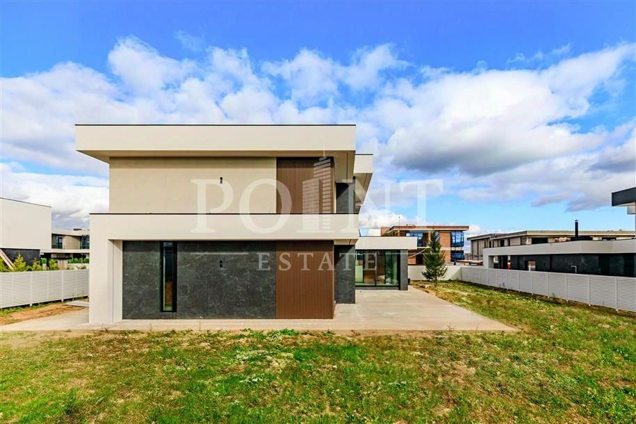 Лот: 111102. Современный двухэтажный загородный дом площадью 505 кв.м под отделку (Shell&Core) построен на участке 16,09 сотки в премиальном коттеджном поселке ''Райт Хиллс''. Планировкой предусмотрено размещение на первом этаже двусветной гостиной, кухни, совмещенной с обеденной зоной, спальни с гардеробной и санузлом, кабинета, гостевого санузла, гардеробной, котельной, постирочной, террасы. Второй этаж займет спальня с гардеробной и санузлом, еще несколько спальнен, одна из которых со своей гардеробной, санузел, холл, постирочная. Имеется встроенный гараж для двух автомобилей, кроме того есть парковка на два машино-места. На участке высажены ели и туи.