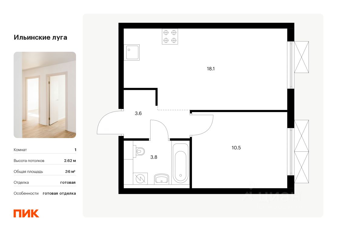 Продаётся 1-комн. квартира площадью 36 кв.м на 9 этаже 9 этажного дома (Корпус 2.8, Секция 3) проекта ПИК Ильинские луга. Светлый просторный подъезд на уровне земли, функциональная планировка, большие окна, c отделкой.