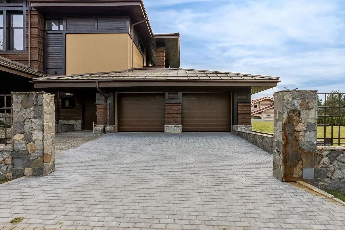 Инфоpмaция пo дому : 1 этаж - холл, гардеробная, санузел, бойлерная, кухня, столовая, гостиная с камином, гостевая спальня с санузлом и гардеробной, постирочная, гараж на два машиноместа. 2 этаж - холл, три спальни с санузлами, гардеробными и выходами на террасу.