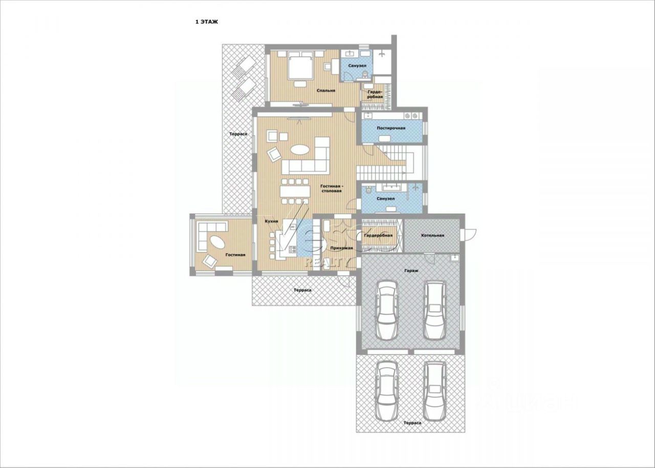 1 этаж: гостиная, кухня, веранда/зимний сад, гостевая спальня с гардеробной и санузлом, прихожая, гардеробная, гостевой санузел, гараж, котельная, 2 этаж: мастер-спальня с санузлом и гардеробной, спальня с гардеробной, спальня, ванная комната, постирочная.