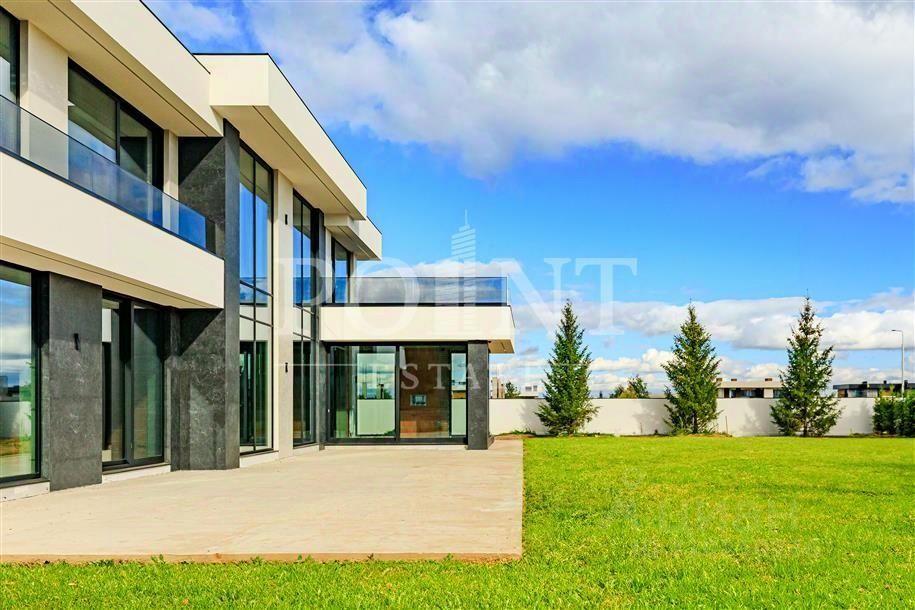 Лот: 111095. Современный двухэтажный загородный дом площадью 621 кв.м под отделку (Shell&Core) построен на участке 21,31 сотки в престижном коттеджном поселке ''Райт Хиллс''. Планировкой предусмотрено размещение на первом этаже двусветной гостиной, кухни, совмещенной с обеденной зоной, спальни с гардеробной и санузлом, кабинета, гостевого санузла, холла, гардеробной, блока для персонала, террасы. Второй этаж займет спальня с гардеробной и санузлом, еще 2 спальни, одна из которых со своей гардеробной, санузел, холл, постирочная. На участке высажены ели и туи.