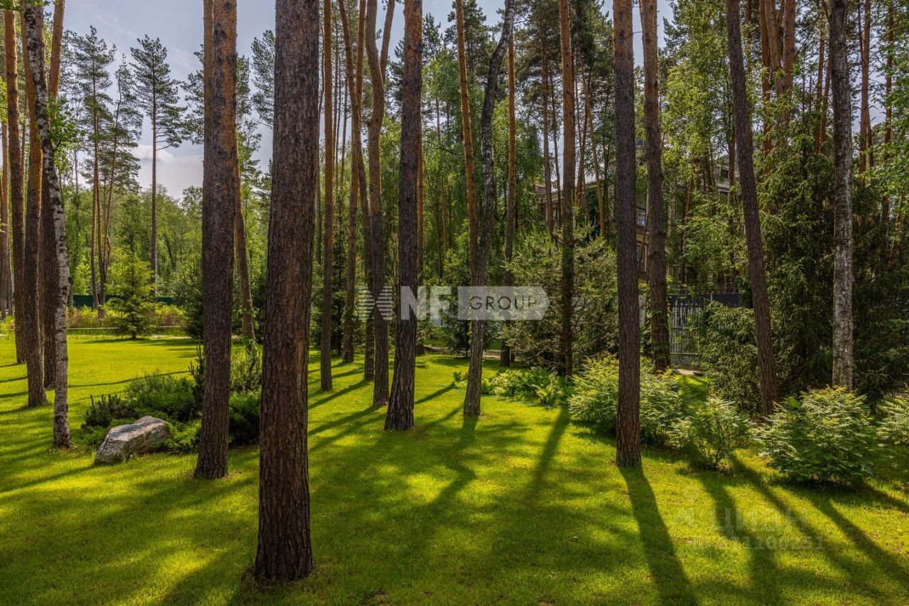 Дом построен на территории соснового бора на участке 30 соток и исключительно скрупулезно вписан в ландшафт: сохранено максимальное количество вековых деревьев, эко-система не нарушена. Дополнительно высажено 350 деревьев и кустарников: горные сосны, можжевельники, ёлки 4-6 м высотой, рябина, папоротники, уникальная 2 раза в год цветущая сирень и украшение входной группы - дерево Ниваки (не путать с бонсаем). На участке выполнен дренаж и подсветка растений и фасада.