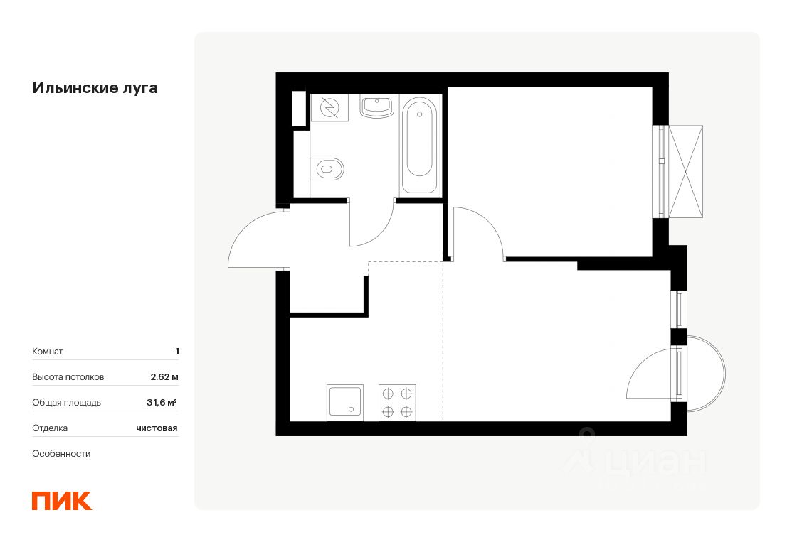 Продаётся 1-комн. квартира площадью 31,6 кв.м на 2 этаже 9 этажного дома (Корпус 3.6, Секция 3) проекта ПИК Ильинские луга. Светлый просторный подъезд на уровне земли, функциональная планировка, большие окна, .