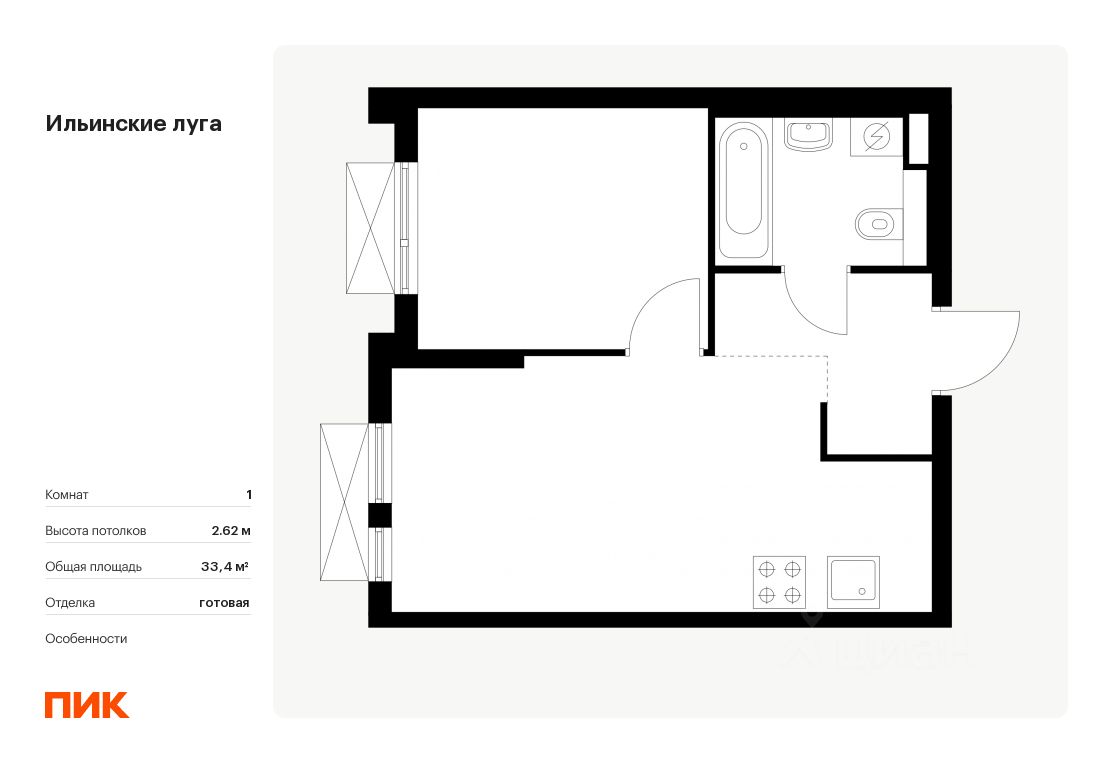 Продаётся 1-комн. квартира площадью 33,4 кв.м на 5 этаже 9 этажного дома (Корпус 3.6, Секция 3) проекта ПИК Ильинские луга. Светлый просторный подъезд на уровне земли, функциональная планировка, большие окна, .