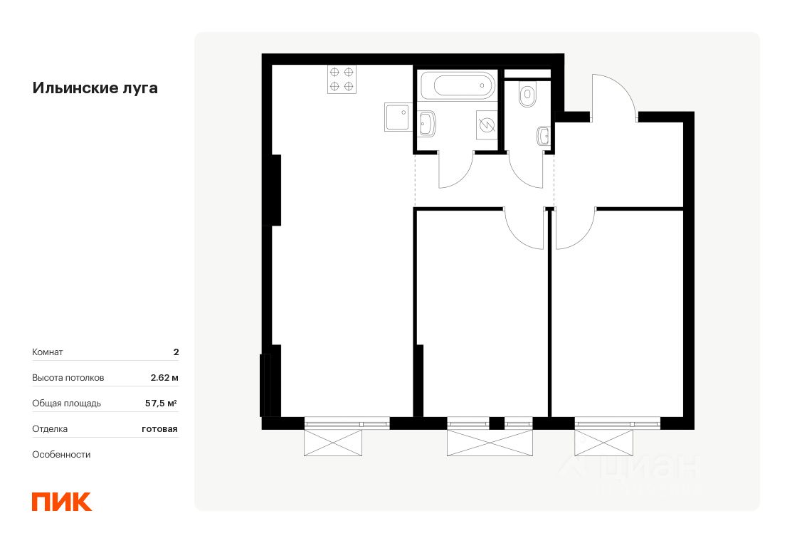 Продаётся 2-комн. квартира площадью 57,5 кв.м на 3 этаже 9 этажного дома (Корпус 3.4, Секция 3) проекта ПИК Ильинские луга. Светлый просторный подъезд на уровне земли, функциональная планировка, большие окна, .