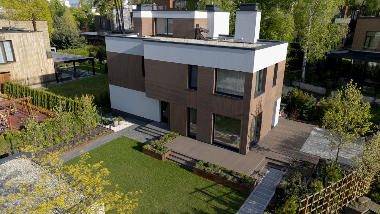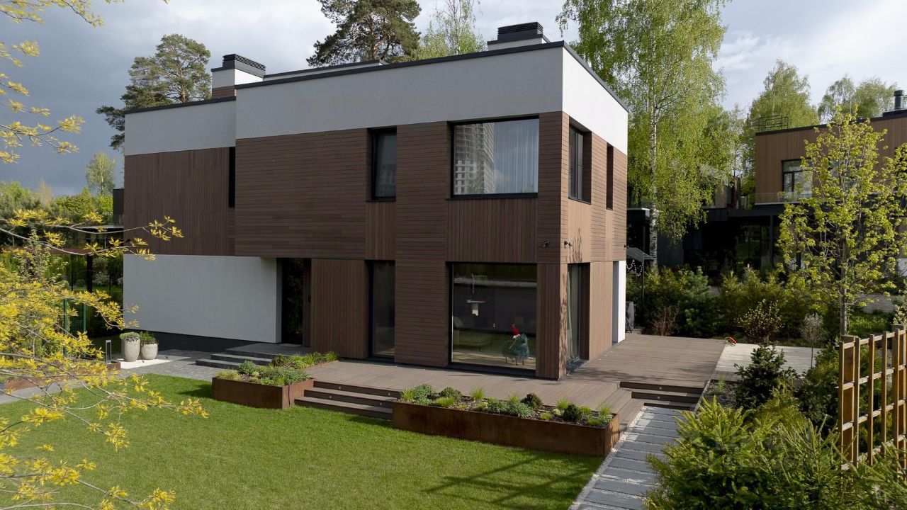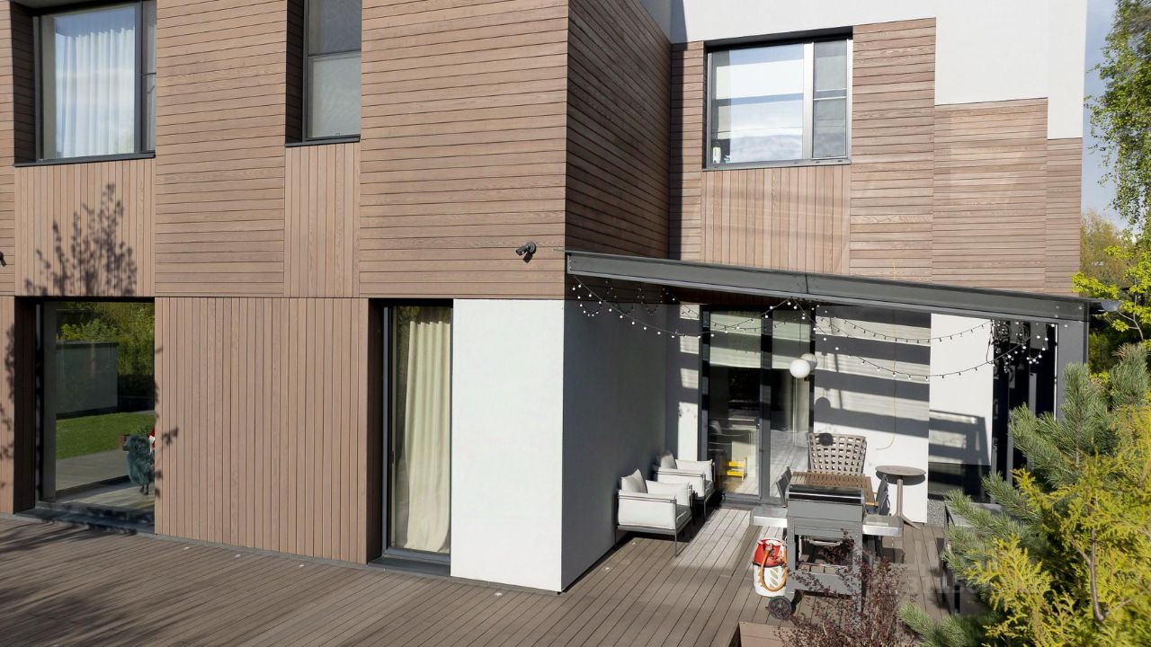 Фасад дома и террасы отделаны деревянными ламелями из дорогой термо-ясени, что придает ему незаурядный и красивый внешний вид, а также, практичный уход.