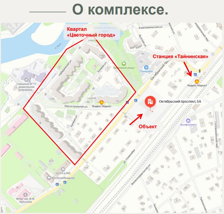 Рядом с объектом находится жилой комплекс ''Цветочный город''. О комплексе: Ансамбль из 7 многоквартирных жилых домов переменной этажности охватывает Микрорайон 22 города Мытищи. Располагается в зоне исторической застройки на берегу реки Яуза и воплощает концепцию города в городе, основанную на европейском опыте квартальной застройки. В перспективе строительство ещё 5 корпусов и гаражных комплексов для жителей микрорайона. На сегодняшний день продано 2781 квартир.