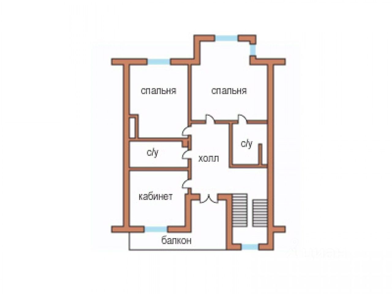 2 этаж: холл, 2 спальни, кабинет, 2 ванные комнаты, балкон.