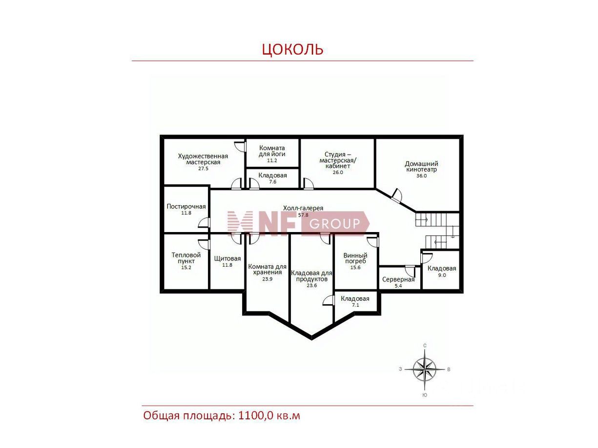 Цоколь: Холл-галерея, домашний кинотеатр, винная комната, художественная мастерская, комната для йоги, студия-мастерская/кабинет, кладовая, постирочная, щитовая, серверная, кладовая для продуктов, комната для хранения, 1 этаж: Прихожая, гардеробная, су, гостиная с камином и вторым светом, кухня-столовая с выходом на просторную террасу с видом на лес, кабинет с камином и выходом на просторную террасу, мастер зона: холл, спальня с выходом на террасу, ванная комната, 2 гардеробные, 2 этаж: Большая детская игровая с балконом, 4 спальни, 2 су.