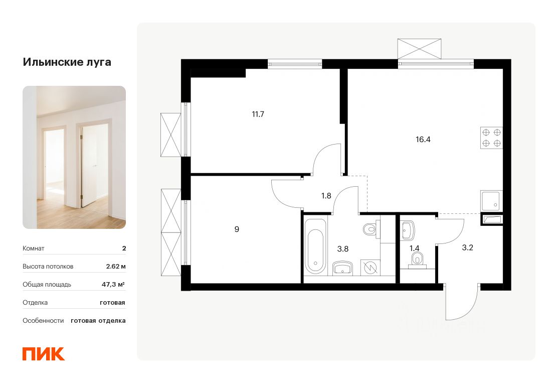 Продаётся 2-комн. квартира площадью 47,3 кв.м на 9 этаже 9 этажного дома (Корпус 2.8, Секция 5) проекта ПИК Ильинские луга. Светлый просторный подъезд на уровне земли, функциональная планировка, большие окна, c отделкой.