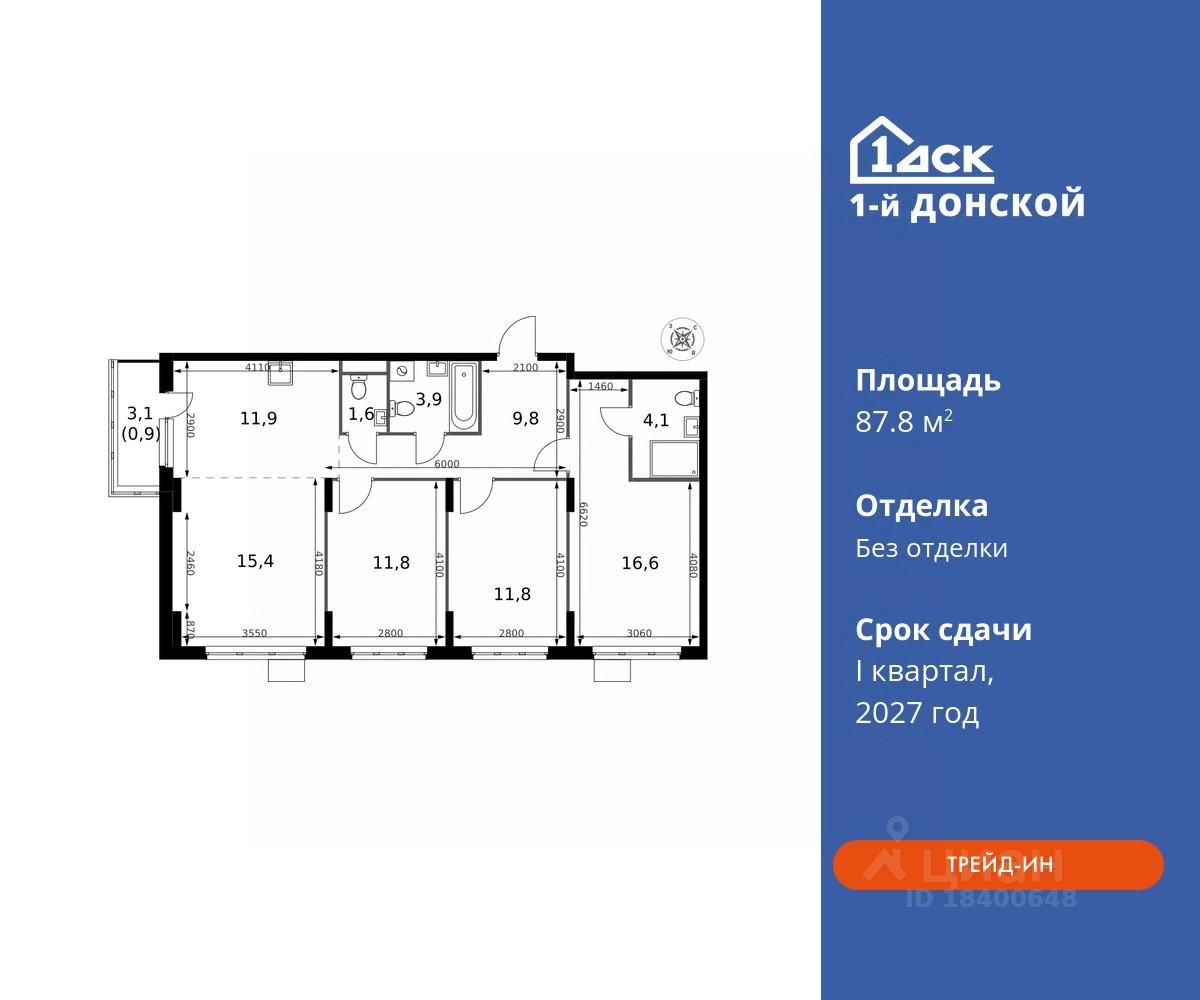 Максимальные скидки при 100% оплате. Trade-in вместо первоначального взноса - выгодно обменяйте вашу квартиру на новую! Прямая продажа от застройщика! Жилой Комплекс класса Комфорт плюс. Продаётся 4-к квартира номер 24 общей площадью 87.8 кв.м на 4-м этаже 24 этажного дома. Без отделки.
