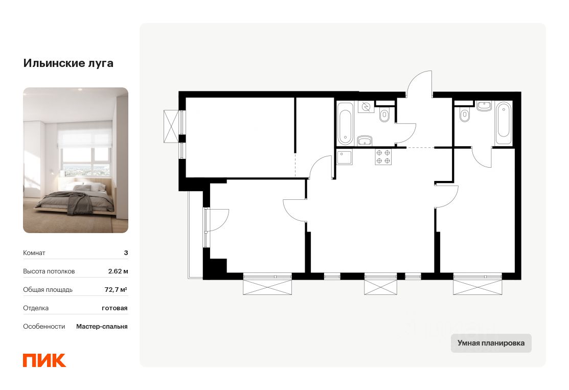 Продаётся 3-комн. квартира площадью 72,7 кв.м на 8 этаже 9 этажного дома (Корпус 3.4, Секция 4) проекта ПИК Ильинские луга. Светлый просторный подъезд на уровне земли, функциональная планировка, большие окна, .