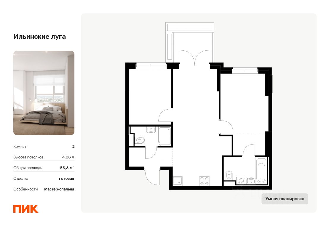 Продаётся 2-комн. квартира площадью 55,3 кв.м на 1 этаже 9 этажного дома (Корпус 3.3, Секция 2) проекта ПИК Ильинские луга. Светлый просторный подъезд на уровне земли, функциональная планировка, большие окна, .