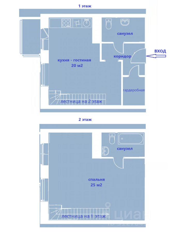 ПЛАНИРОВКА:1 этаж - большая кухня-гостиная, балкон, гардеробная, санузел. 2 этаж- большая спальня, где помещается двуспальная кровать и еще много пространство, где можно организовать детскую или рабочее место, санузел.
