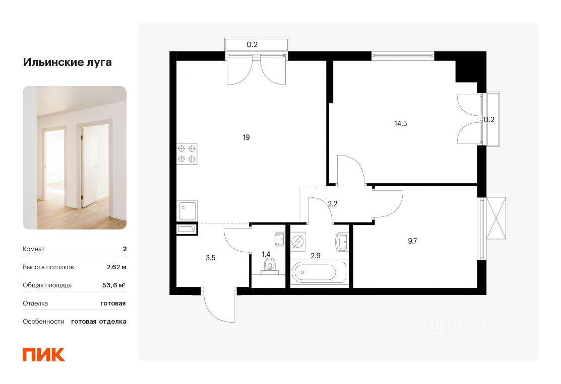 Продаётся 2-комн. квартира площадью 53,6 кв.м на 3 этаже 9 этажного дома (Корпус 2.9, Секция 2) проекта ПИК Ильинские луга. Светлый просторный подъезд на уровне земли, функциональная планировка, большие окна, c отделкой.