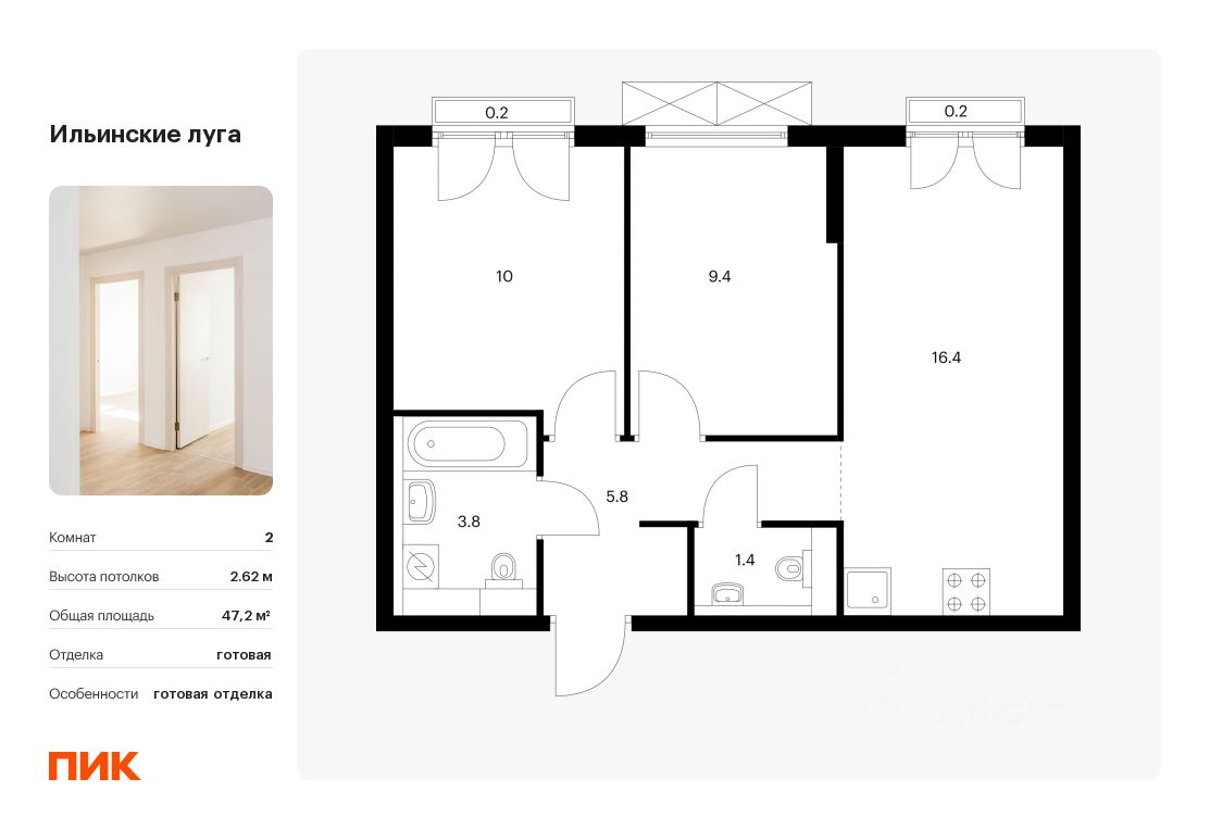 Продаётся 2-комн. квартира площадью 47,2 кв.м на 2 этаже 9 этажного дома (Корпус 2.8, Секция 4) проекта ПИК Ильинские луга. Светлый просторный подъезд на уровне земли, функциональная планировка, большие окна, c отделкой.