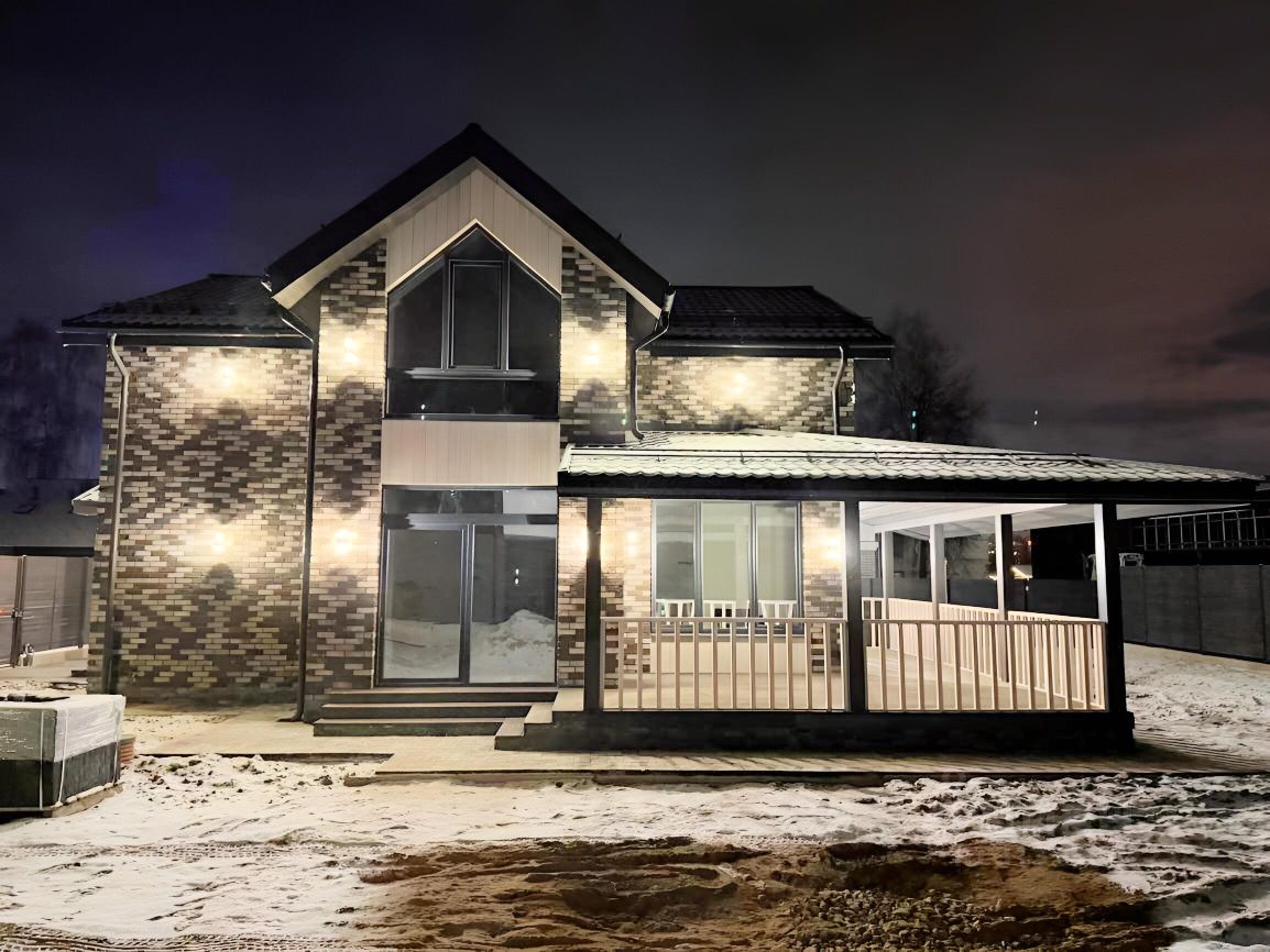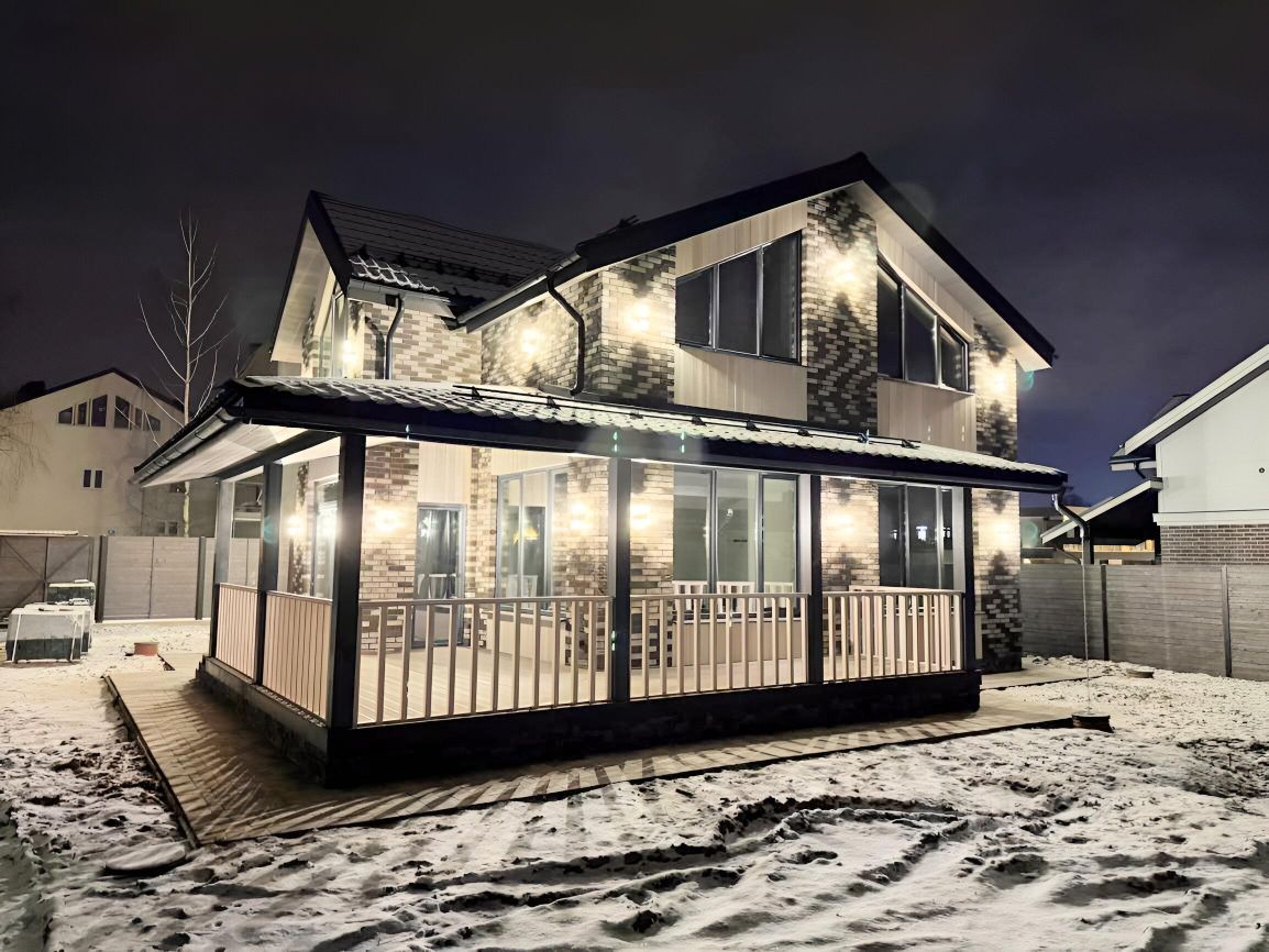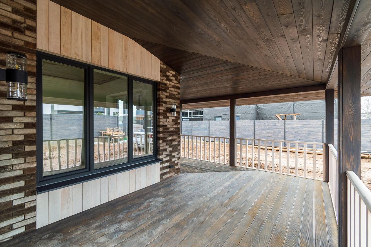 Описание дома: 1. Площадь дома 151м2 , с верандами около 170м2 2. Материал стен - теплая керамика Porotherm 38 Thermo. 3. Окна Rehau с отражающим покрытием и ламинацией. Панорамное сдвижное окно PSK portal на 1 этаже в холле. 4. Металлическая кровля, подшив крыши лиственница. 5. Облицовка - клинкерный кирпич ручной формовки + лиственница сорта Экстра. 6. Установлена дренажная система по периметру дома. 7. Полностью сделана электрика, все выводы под розетки и выключатели, свет, кондиционеры, кухню и пр. 8. Полностью сделано отопление, вода, теплые полы, вентиляция. Металлическая обвязка в котельной. Дорогие котлы BAXI с модулем удаленного доступа. 9. Дом полностью готов к косметическому ремонту. Выполнена стяжка пола и штукатурка под обои. 10. На улице установлены забор на бетонном основании и ворота шириной 4 метра с мотором. Также закуплена брусчатка на парковочную площадку. 11. Веранда и крыльцо полностью выполнены из лиственницы класса Экстра.