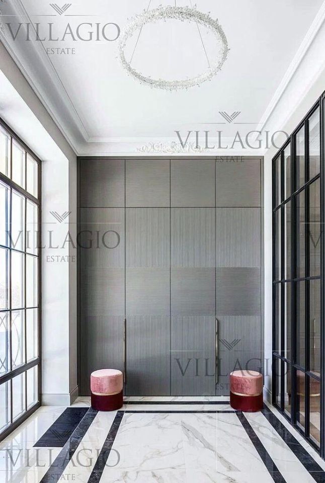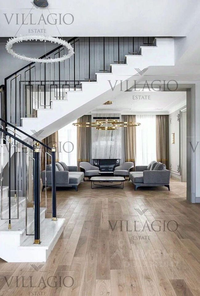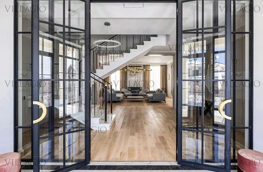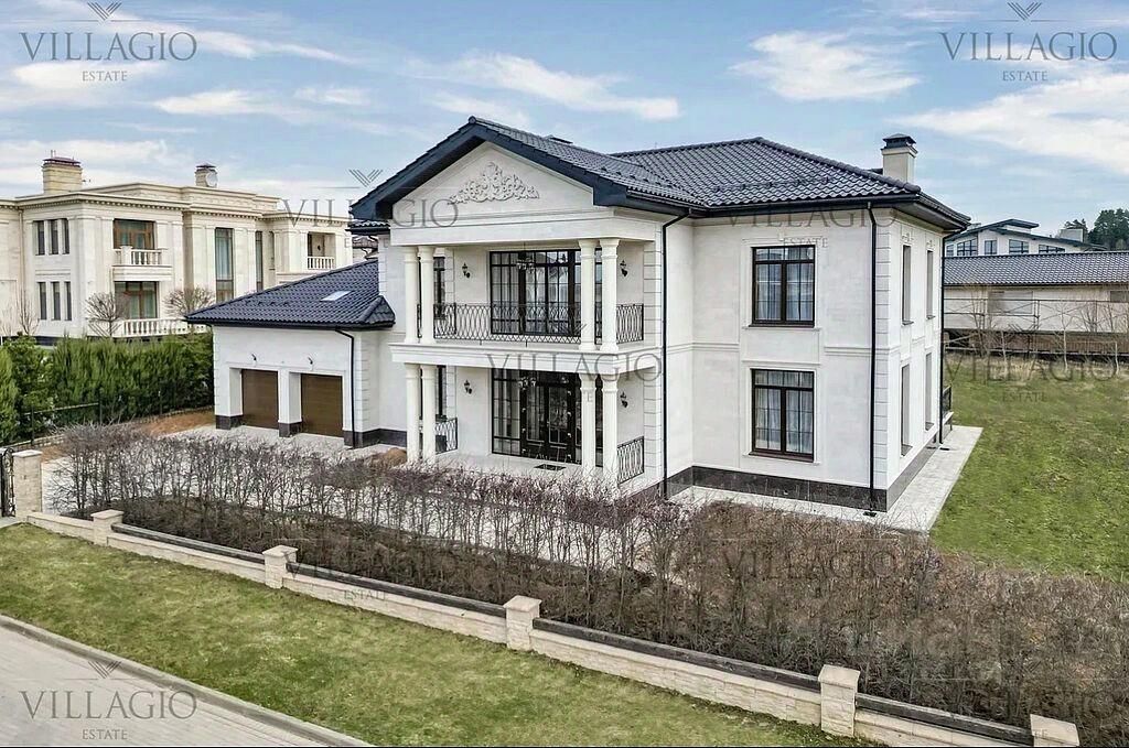Это дом с 5 спальнями, 3 гардеробными и 4 ванными комнатами. На первом этаже гостиная с камином, столовая и кухня. На втором этаже — спальни, гардеробные, ванные комнаты. В доме есть кабинет и помещение для персонала. На первом этаже также оборудован гараж.